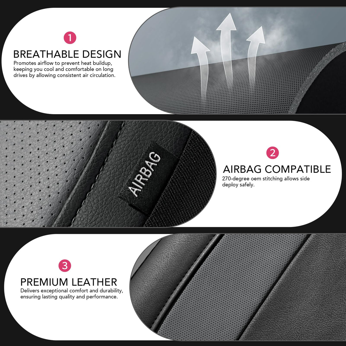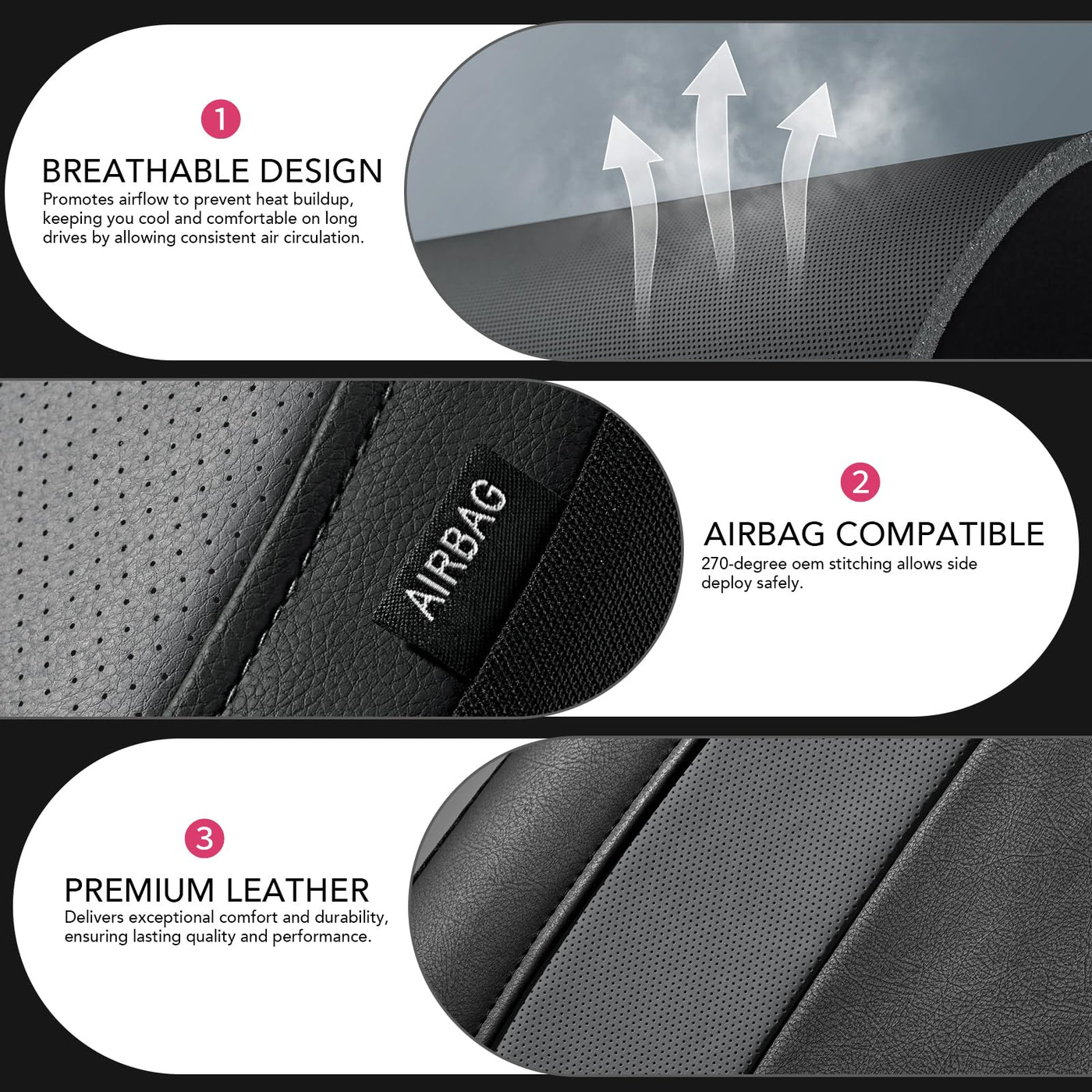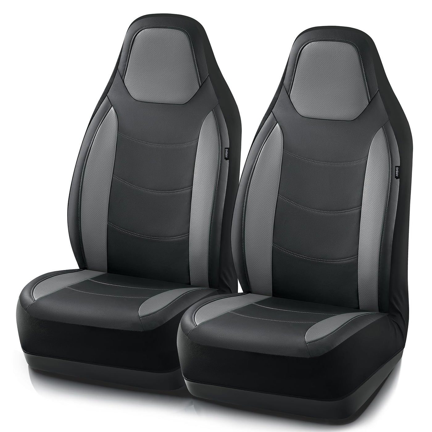 PREMIUM LEATHER MATERIAL - Perfectly match your interior look. Ensure your seat covers will last for many years. Refresh your interior look. Beautiful design with good quality. | HIGH BACK SEAT COVERS - High back design to fit the detachable and non-detachable headrest covers. *Consists of a Three panel design for a perfect fit. Other brands only have 2 panels. | AIRBAG COMPATIBLE - 270 Degree OEM air bag stitching seam, safe seam technology allows cover stitching to separate for side airbag deployment in the event of an accident. | UNIVERSAL FIT - These automotive seat covers are designed to fit most vehicles with non-removable headrests, including most cars, SUVs, and trucks. Please check your vehicle before purchasing. | EASY TO INSTALL & CLEAN - Includes 2 front seat covers for front seats only. Elastic straps allow for quick and easy installation. Simply wipe with a damp cloth to clean. Machine washing is not recommended.