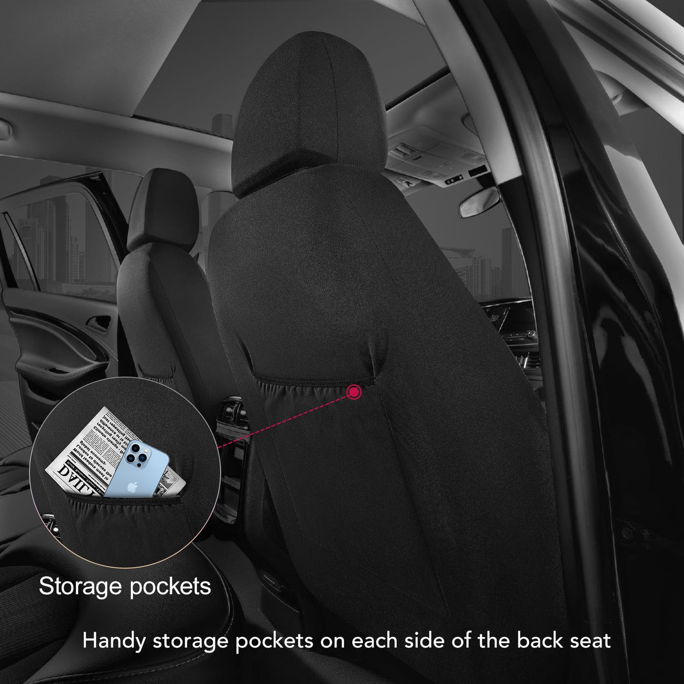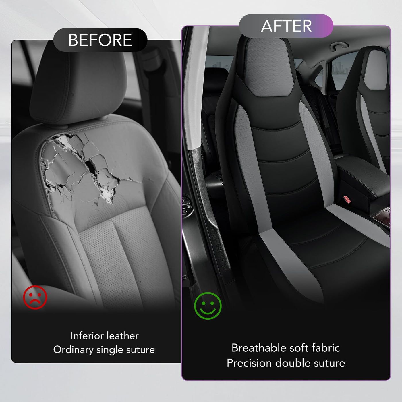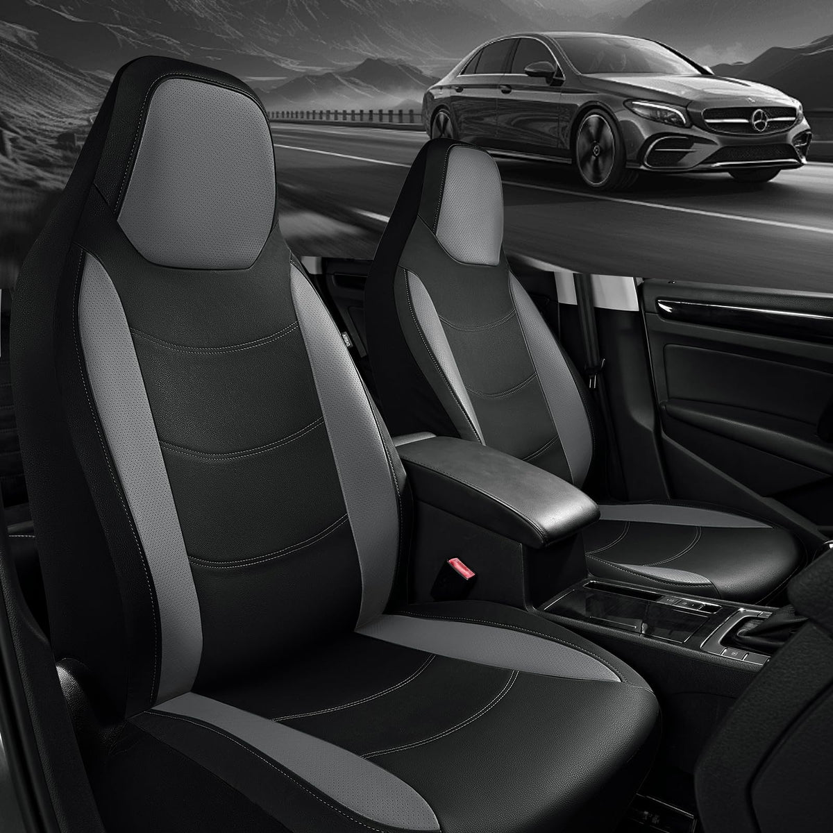 PREMIUM LEATHER MATERIAL - Perfectly match your interior look. Ensure your seat covers will last for many years. Refresh your interior look. Beautiful design with good quality. | HIGH BACK SEAT COVERS - High back design to fit the detachable and non-detachable headrest covers. *Consists of a Three panel design for a perfect fit. Other brands only have 2 panels. | AIRBAG COMPATIBLE - 270 Degree OEM air bag stitching seam, safe seam technology allows cover stitching to separate for side airbag deployment in the event of an accident. | UNIVERSAL FIT - These automotive seat covers are designed to fit most vehicles with non-removable headrests, including most cars, SUVs, and trucks. Please check your vehicle before purchasing. | EASY TO INSTALL & CLEAN - Includes 2 front seat covers for front seats only. Elastic straps allow for quick and easy installation. Simply wipe with a damp cloth to clean. Machine washing is not recommended.
