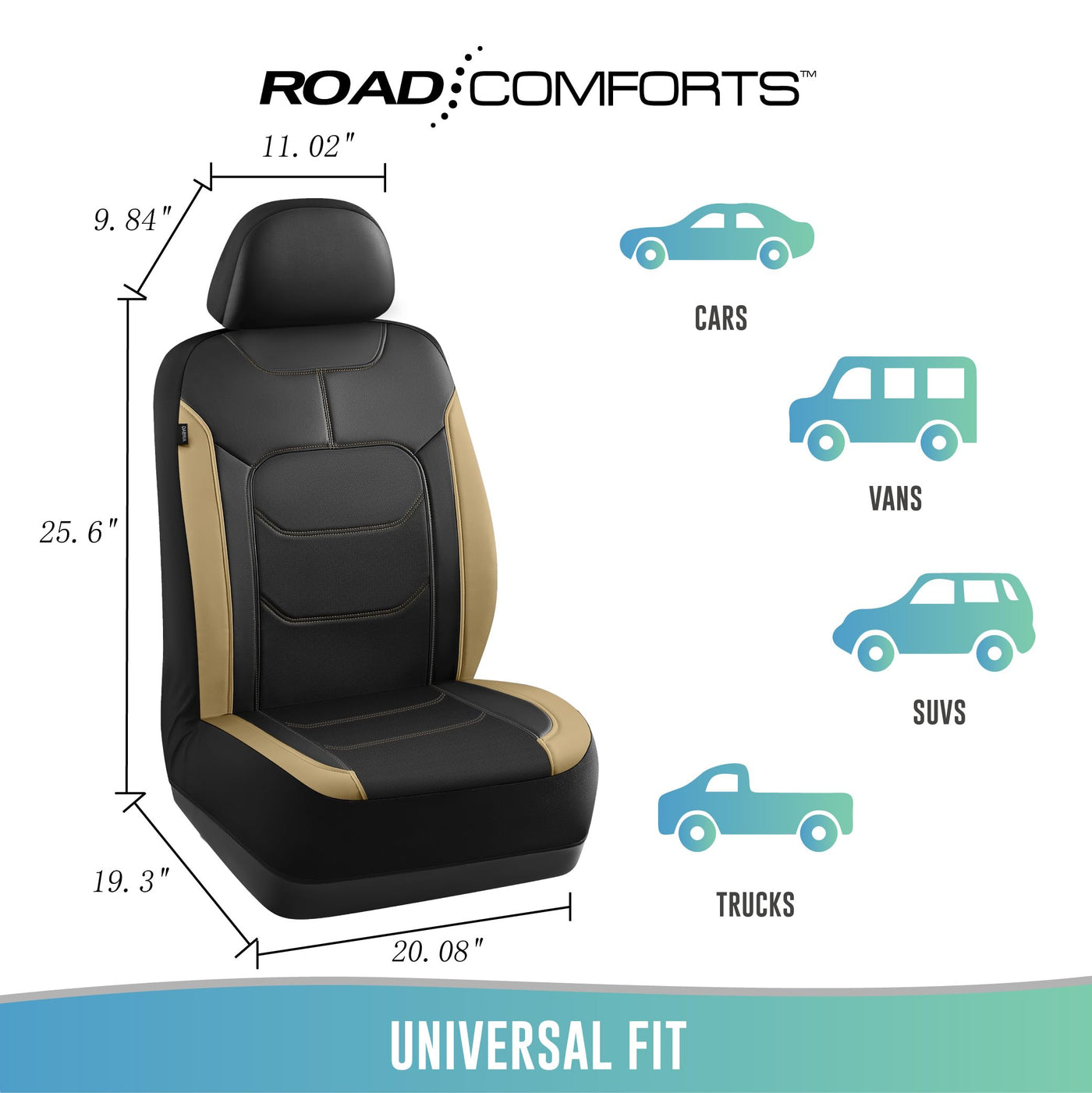 Premium Leather Material: Crafted from durable, high-grade leather that offers a luxurious feel while ensuring long-lasting use and resistance to wear and tear. | Airbag Compatibility: Our seat cover includes special stitching to ensure safe deployment of airbags in case of an accident, prioritizing your safety. | Stylish Design: Available in various colors, the Road Comforts Leather Front Car Seat Cover adds a touch of elegance to your vehicle's interior, complementing your personal style. | Universal Fit: This seat cover is designed to fit a variety of vehicles, including cars, trucks, SUVs, and vans. Adjustable straps ensure a secure and snug fit for most front seats. | Easy Care & Maintenance - The leather surface is resistant to spills and stains, requiring only a simple wipe with a damp cloth to keep it looking fresh and clean.