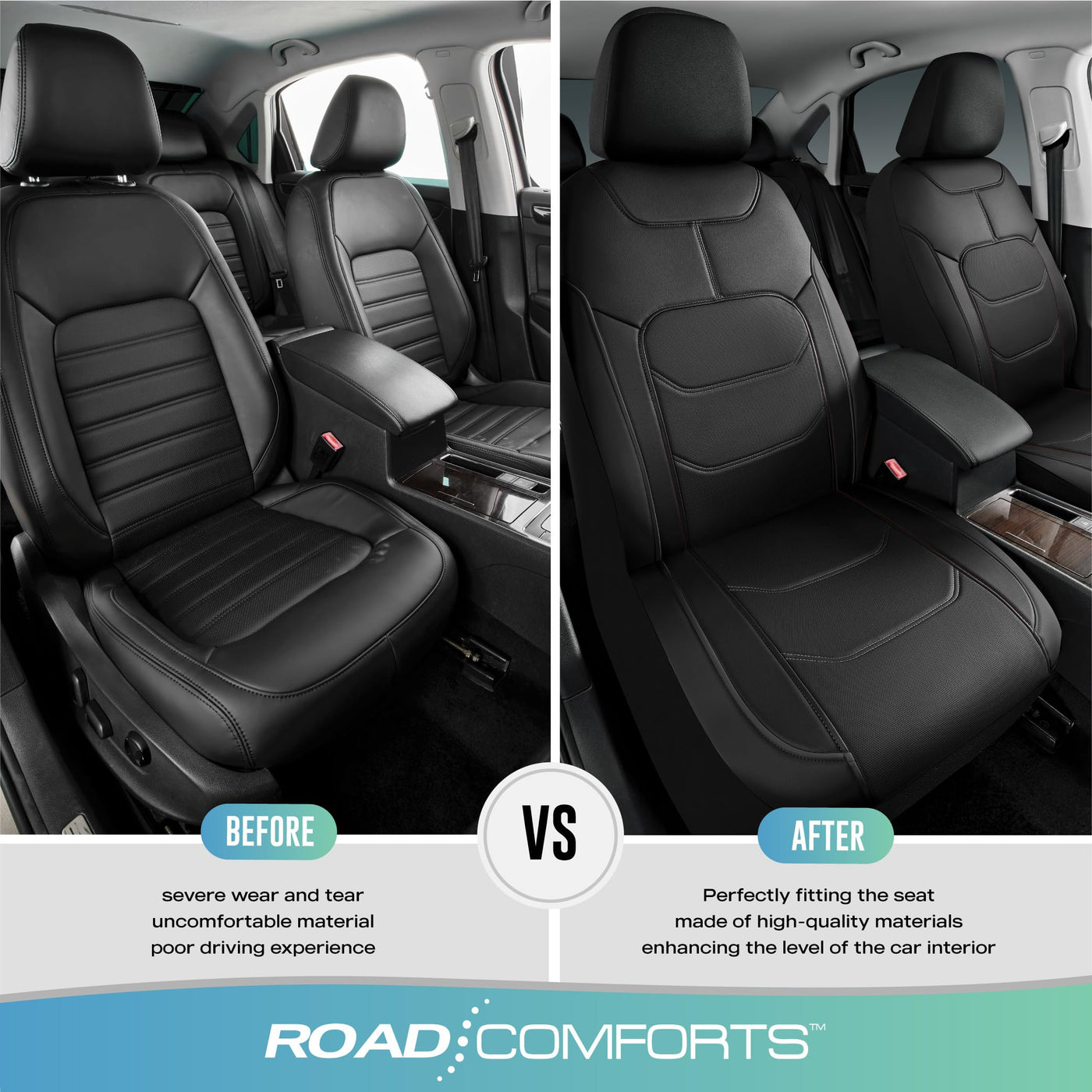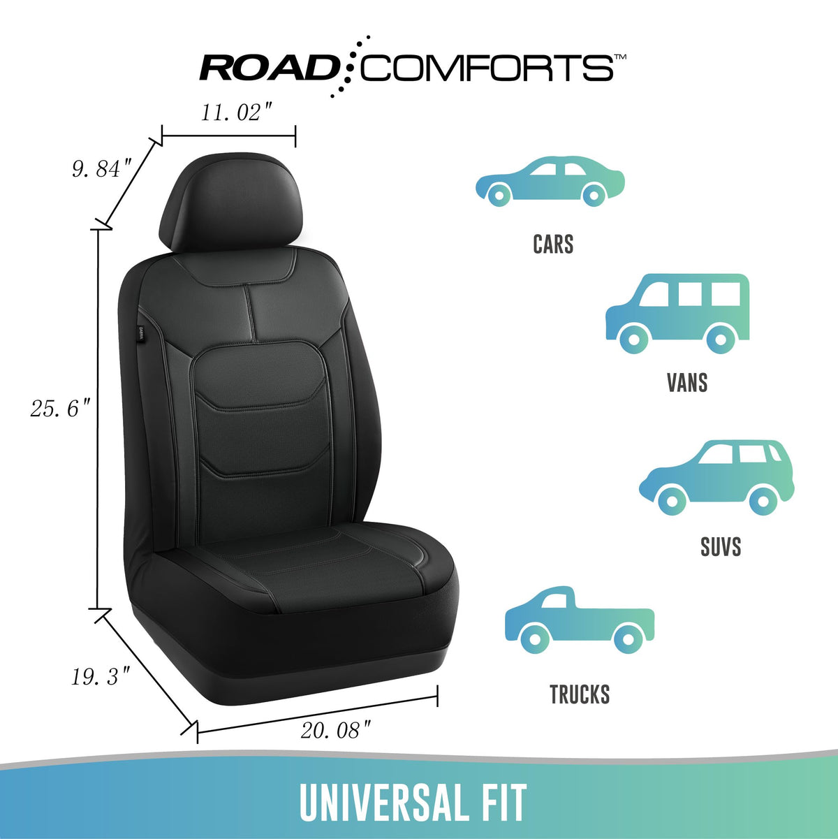 Premium Leather Material: Crafted from durable, high-grade leather that offers a luxurious feel while ensuring long-lasting use and resistance to wear and tear. | Airbag Compatibility: Our seat cover includes special stitching to ensure safe deployment of airbags in case of an accident, prioritizing your safety. | Stylish Design: Available in various colors, the Road Comforts Leather Front Car Seat Cover adds a touch of elegance to your vehicle's interior, complementing your personal style. | Universal Fit: This seat cover is designed to fit a variety of vehicles, including cars, trucks, SUVs, and vans. Adjustable straps ensure a secure and snug fit for most front seats. | Easy Care & Maintenance - The leather surface is resistant to spills and stains, requiring only a simple wipe with a damp cloth to keep it looking fresh and clean.