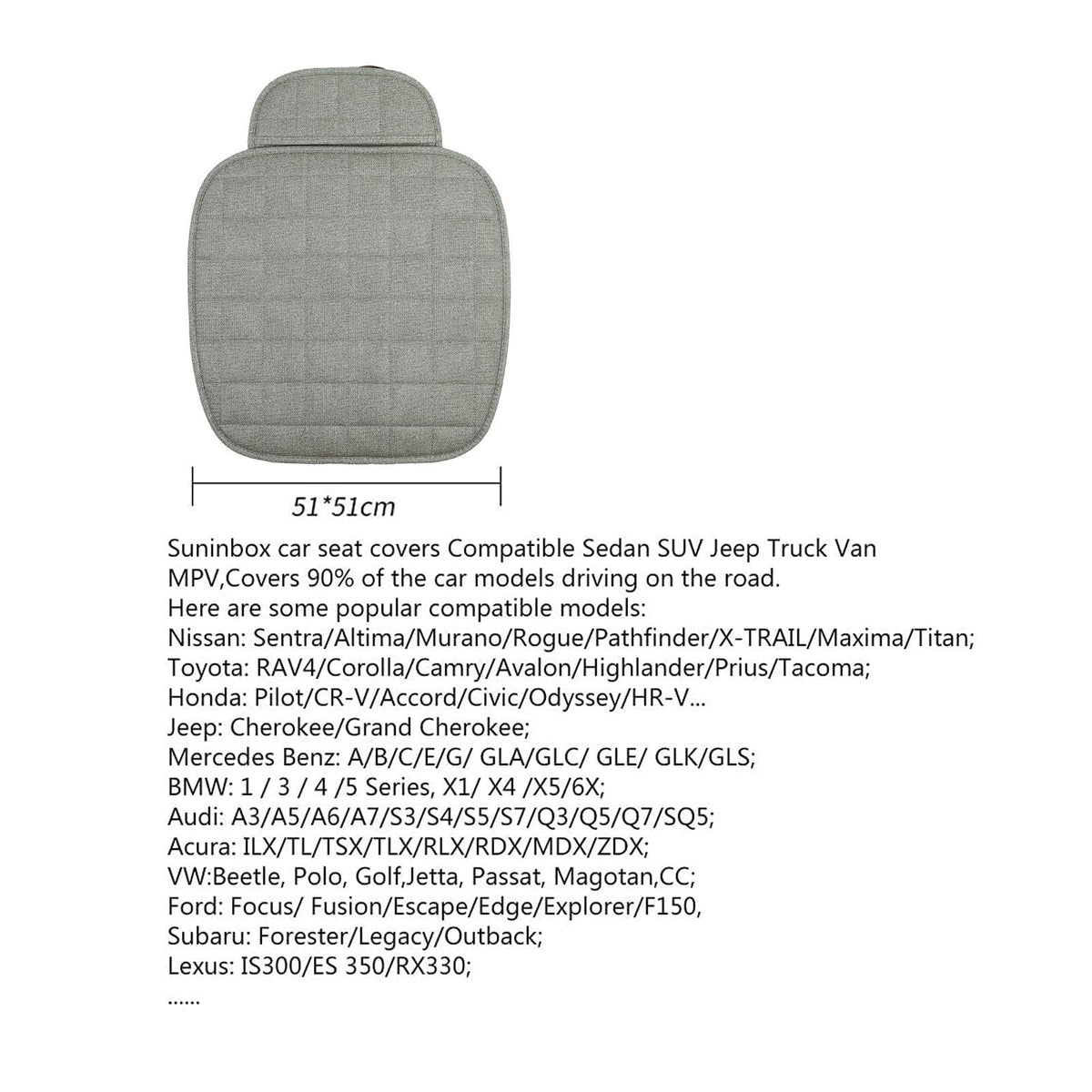 Suninbox seat cover is suitable for use in small cars, medium cars and large trucks. It is suitable for 90% of car models driving on the road.Car Seat Covers Specification: Color:Gray Surface material: linen Inner material: sponge Package Includes: 2 X front car seat cover Size: 18.9*18.90 inches Thickness: 0.9~1.2cm Notice: The measurement may have 0.39-1.18 inch inaccurate errors.
