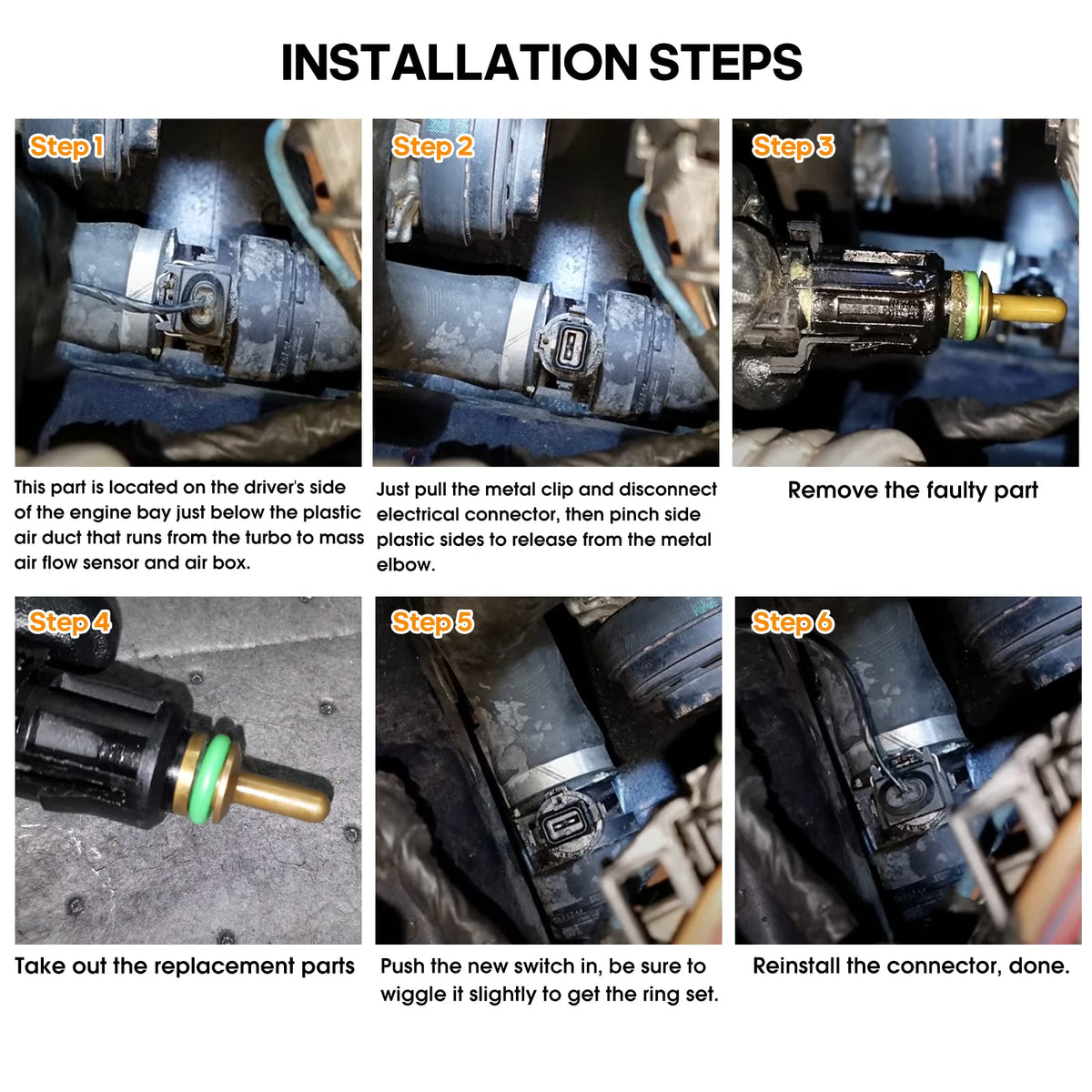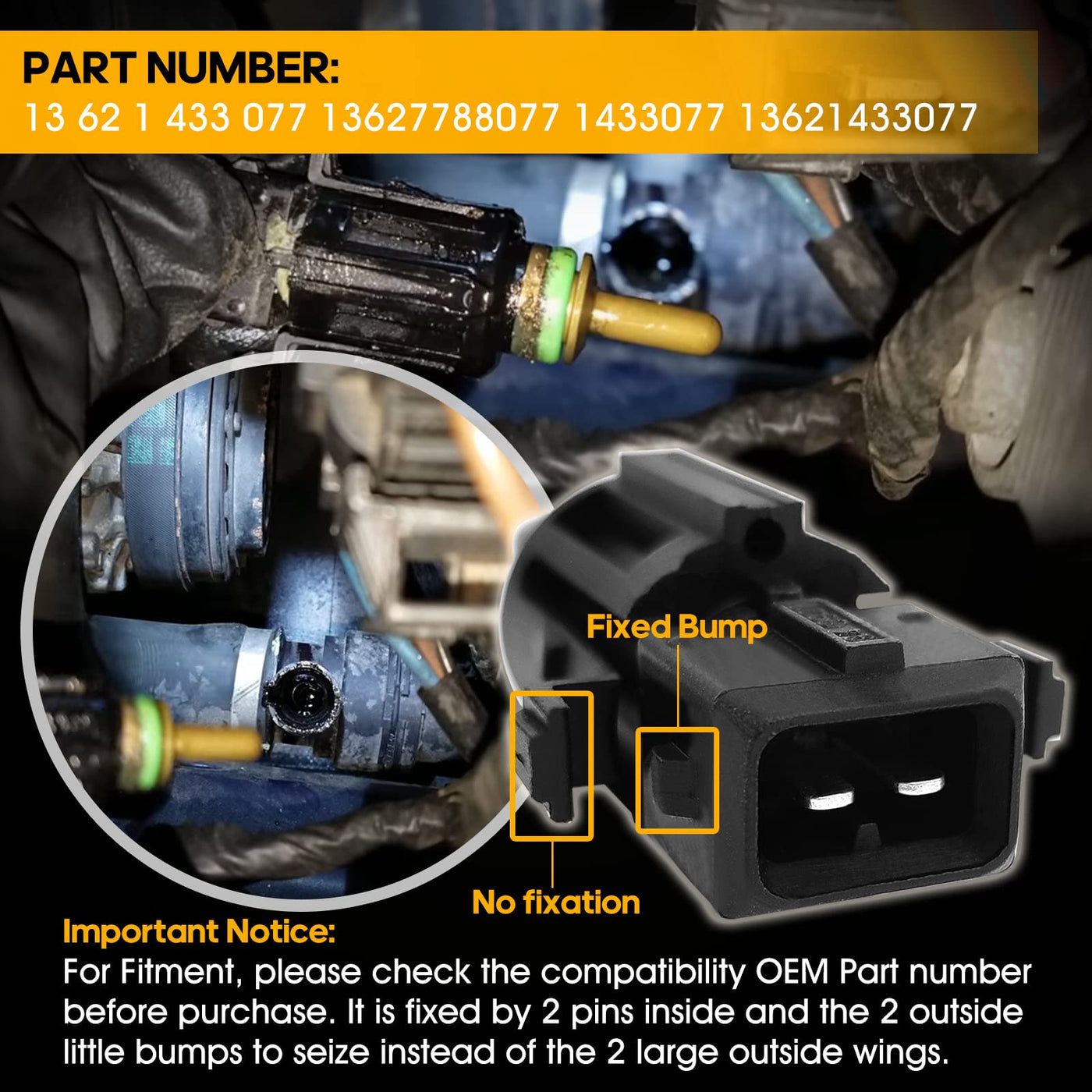 Q: How do I ensure that the coolant temperature sensor fits my vehicle?A: To ensure proper fitment, please check the compatibility OEM part number before purchase. This sensor is fixed by two pins inside and two outside bumps, rather than the two large outside wings found in some models.