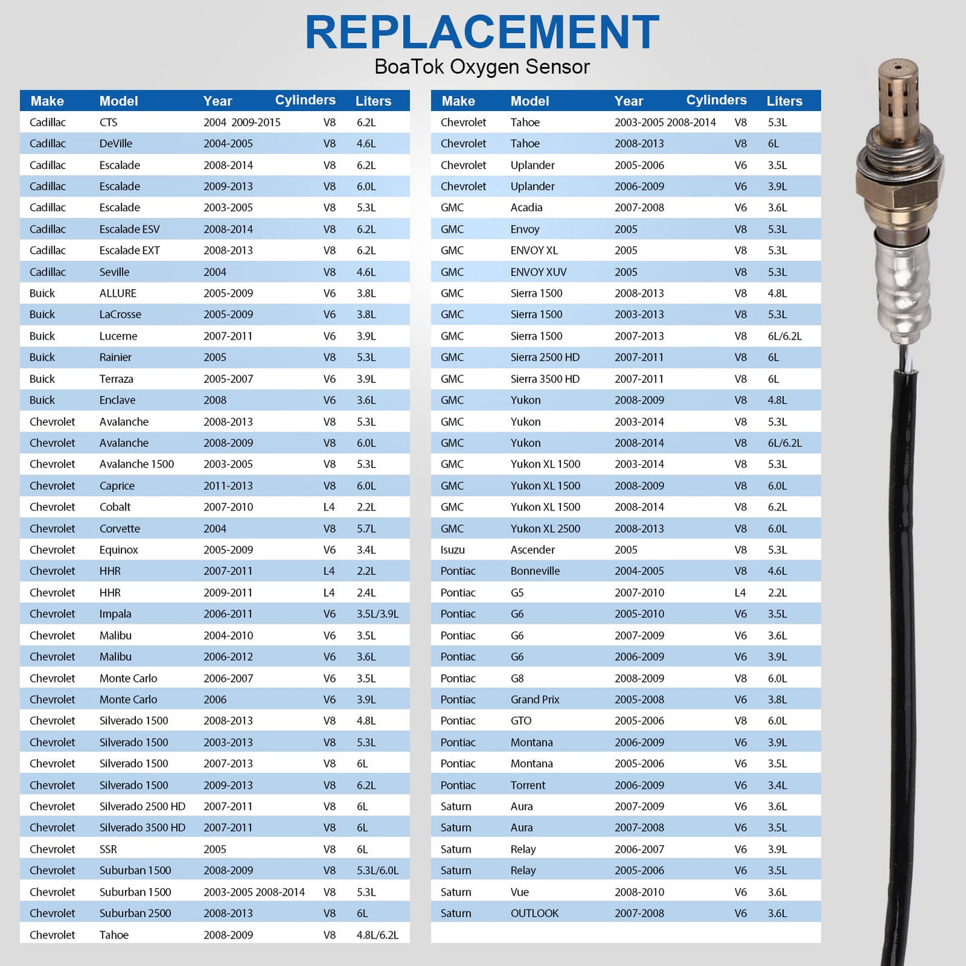 Q: What vehicles are compatible with the BoaTok 2PCS Oxygen Sensor 234-4668?A: The BoaTok 2PCS Oxygen Sensor 234-4668 is compatible with a variety of vehicles including Chevrolet Avalanche 1500, Silverado 1500 2500 HD 3500 HD, GMC Sierra 1500 2500 HD 3500 HD, Buick Allure, LaCrosse, Lucerne, Cadillac Escalade, and several models from Pontiac and Saturn.