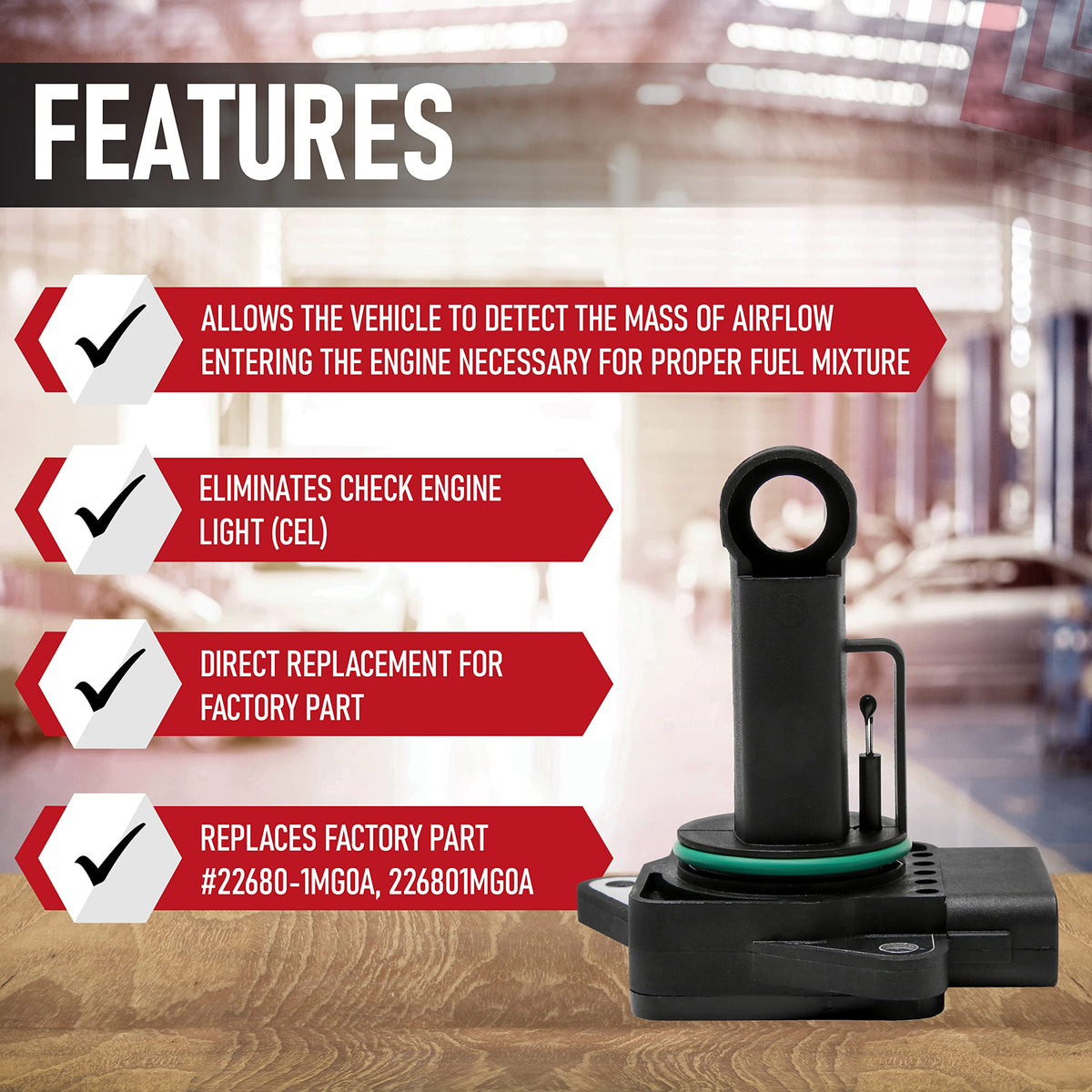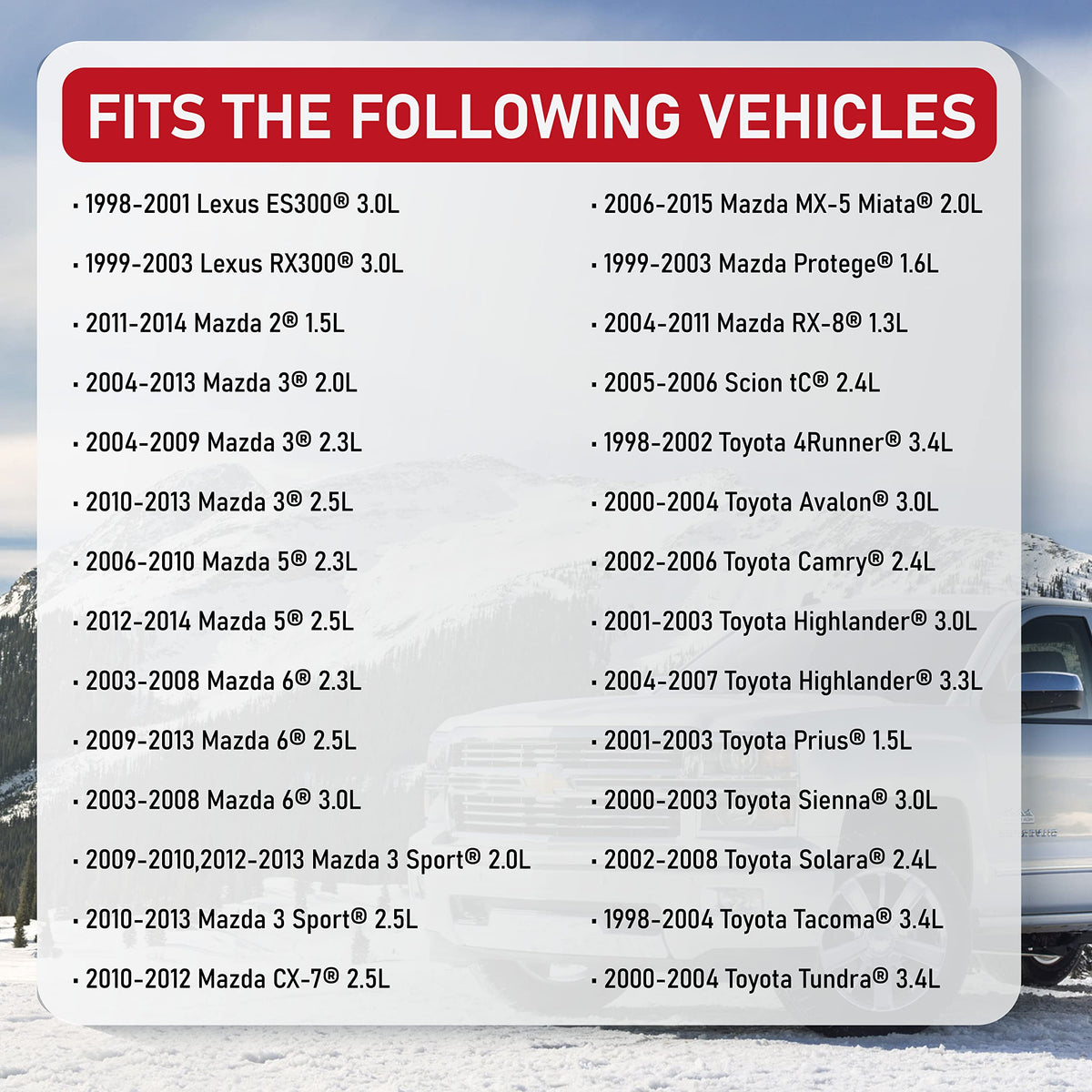 Also known as the MAF Sensor allows the vehicle to detect the mass of airflow entering the engine necessary for proper fuel mixture. Over time the factory MAF sensor can fail or accumulate dirt and oil causing the vehicle into some running issues or light up a CEL (Check Engine Light). If your vehicle is running rough, hesitating after starting or experiencing poor fuel economy then you may have a problem with your mass air sensor. The MAF Sensor can easily be located beside the air intake box inside the engine bay. Compatible with the following vehicles: 1998-2001 ES300 3.0L 1999-2003 RX300 3.0L 2011-2014 2 1.5L 2004-2013 3 2.0L 2004-2009 3 2.3L 2010-2013 3 2.5L 2006-2010 5 2.3L 2012-2014 5 2.5L 2003-2008 6 2.3L 2009-2013 6 2.5L 2003-2008 6 3.0L 2009-2010,2012-2013 3 Sport 2.0L 2010-2013 3 Sport 2.5L 2010-2012 CX-7 2.5L 2006-2015 MX-5 Miata 2.0L 1999-2003 Protege 1.6L 2004-2011RX-8 1.3L 2005-2006 tC 2.4L 1998-2002 4Runner 3.4L 2000-2004 Avalon 3.0L 2002-2006 Camry 2.4L 2001-2003 Highlander 3.0L 2004-2007 Highlander 3.3L 2001-2003 Prius 1.5L 2000-2003 Sienna 3.0L 2002-2008 Solara 2.4L 1998-2004 Tacoma 3.4L 2000-2004 Tundra 3.4L Replaces part numbers: 22204-21010, 197-6020, L321-13-215, 45-1095, 336-05231, 917-817, 158-0777, 74-50009 This is a compatible replacement part manufactured by AA Ignition. This MAF sensor assembly is NOT a genuine OEM part. Vehicle makes and their associated vehicle models and part numbers are used in this listing only to identify the vehicles this mass air flow sensor fits.