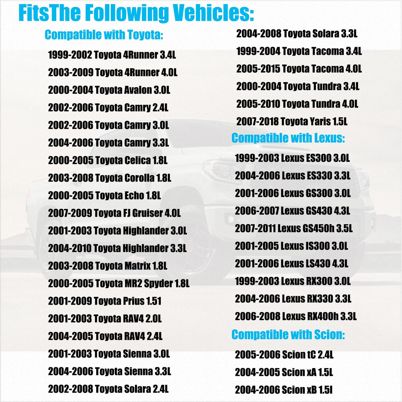 1999-03 Compatible with Lexus ES300/ RX300 3.0L V6 2004-06 Compatible with Lexus ES330/ RX330 3.3L V6 2001-05 Compatible with Lexus GS300/IS300 3.0L L6 2007-11 Compatible with Lexus GS450h 3.5L V6 2001-06 Compatible with Lexus LS430 4.3L V8 2006-08 Compatible with Lexus RX400h 3.3L V6 1999-02 Compatible with Toyota 4Runner 3.4L V6 2003-09 Compatible with Toyota 4Runner 4.0L V6 2000-04 Compatible with Toyota Avalon 3.0L V6 2002-06 Compatible with Toyota Camry 2.4L L4/3.0L V6 2000-05 Compatible with Toyota Celica/ MR2 Spyder 1.8L L4 2000-05 Compatible with Toyota Celica 1.8L L4 2003-08 Compatible with Toyota Corolla/Matrix 1.8L L4 2000-05 Compatible with Toyota Echo 1.5L L4 2007-09 Compatible with Toyota FJ Cruiser 4.0L V6 2001-07 Compatible with Toyota Highlander 2.4L L4 2001-03 Compatible with Toyota Highlander/ Sienna 3.0L V6 2004-10 Compatible with Toyota Highlander 3.3L V6 2001-09 Compatible with Toyota Prius 1.5L L4 2000-03 Compatible with Toyota RAV4 2.0L L4 2004-05 Compatible with Toyota RAV4 2.4L L4 2000-03 Compatible with Toyota RAV4 ELECTRIC 2004-06 Compatible with Toyota Sienna 3.3L V6 2002-08 Compatible with Toyota Solara 2.4L L4 2005-08 Compatible with Toyota Solara 3.3L V6 1999-04 Compatible with Toyota Tacoma 3.4L V6 2005-10 Compatible with Toyota Tacoma/ Tundra 4.0L V6 2000-04 Compatible with Toyota Tundra 3.4L V6 2006-12 Compatible with Toyota Yaris 1.5L L4