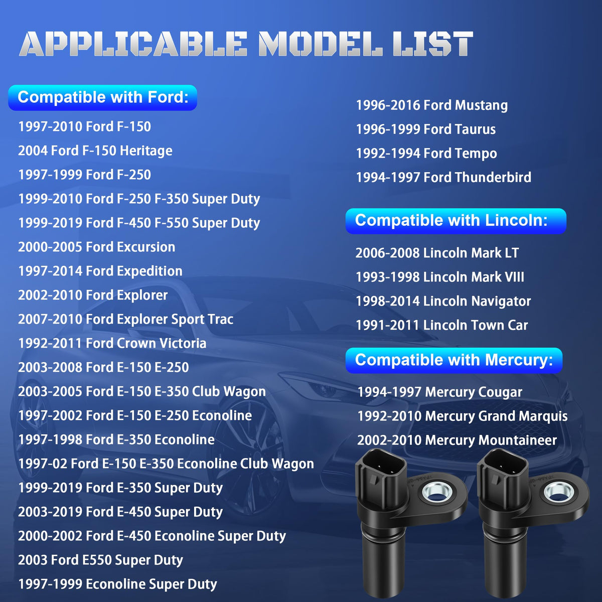 Package Included: 2x Car camshaft position sensor oem Compatible with: 1994-2011 Ford Crown Victoria 4.6L 2003-2008 Ford E-150 4.6L 2004-2005 Ford E-150 Club Wagon 4.6L 1997-2002 Ford E-150 Econoline 4.6L 5.4L 2003-2008 Ford E-250 4.6L 5.4L 1998-2002 Ford E-250 Econoline 5.4L 2003-2005 Ford E-350 Club Wagon 5.4L 1997-1998 Ford E-350 Econoline 5.4L 6.8L 1998-2002 Ford E-350 Econoline Club Wagon 5.4L 1999-2008 Ford E-350 Super Duty 5.4L 1999-2017 Ford E-350 Super Duty 6.8L 2000-2002 Ford E-450 Econoline Super Duty 6.8L 2003-2016 Ford E-450 Super Duty 6.8L 2000-2005 Ford Excursion 5.4L 6.8L 1997-2004 Ford Expedition 4.6L 1997-2012 Ford Expedition 5.4L 2002-2010 Ford Explorer 4.6L 2007-2010 Ford Explorer Sport Trac 4.6L 1997-2010 Ford F-150 4.6L 5.4L 2004 Ford F-150 Heritage 4.6L 5.4L 1997-1999 Ford F-250 4.6L 5.4L 1999-2010 Ford F-250 Super Duty 5.4L 1999-2004 Ford F-250 Super Duty 6.8L 1999-2010 Ford F-350 Super Duty 5.4L 1999-2004 Ford F-350 Super Duty 6.8L 1999-2016 Ford F-450 Super Duty 6.8L 1999-2016 Ford F-550 Super Duty 6.8L 1996-2010 Ford Mustang 4.6L 1995-1997 Ford Thunderbird 4.6L 2000-2001 Jaguar S-Type 3.0L 2005 Lincoln Aviator 4.6L 2006-2008 Lincoln Mark LT 5.4L 1998 Lincoln Mark VIII 4.6L 1998-2014 Lincoln Navigator 5.4L 1992-2011 Lincoln Town Car 4.6L 1992-2010 Mercury Grand Marquis 4.6L 2002-2008 Mercury Mountaineer 4.6L