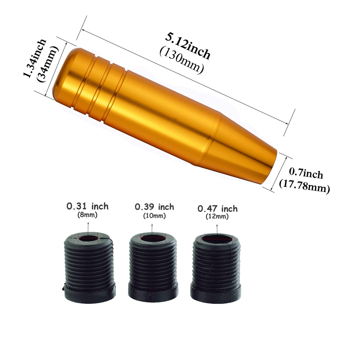 Description Feature: The automatic gear shift knob not only has stylish design, shape like a pend, bright colors, but also offers a great control and your driving comfort. It is very easy to install and fix your car. this handsome sTyre stick shifter head is fit for most automatic or manual transmission vehicles, but please make sure it fits you car before place an order. Specification: 1.Product name: Gear Shifter knob 2.Material :Aluminum alloy 3.Color: Gold 4.Adapters inner diameter:0.31inch,0.39inch,0.47inch(8mm,10mm,12mm) Package Include: 1 x Car Shifter Knob 3 x Adapters Installation Steps 1.Remove the original handle gear shifter. 2.Remove the aluminum alloy cover from the bottom of the original car shifter head 3.Match the size of your gear stick from one of 3 black rubber adapters, and install on the gear stick. 4.Put the new shift knob head into shifter stick 5.Put the aluminum alloy cover on the bar, the shifter knob is also set on the bar and tighten Tips: 1. If your car reverse gear needs to be lifted, then it can't be used 2. If your car reverse gear needs button lock, then it can't be used 3. If your original shift knob can't be removed, then it can't be used. 4. If the three screw sizes are not suitable for your car, I suggest that you can use tape wrapping on your gear stick and then tighten it to solve this problem.5.this gear shift is not suitable for car models, if you have any questions, please consult before buying