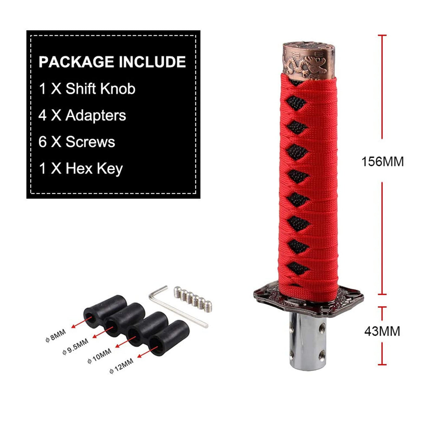 'Katana Style Katana Sword Style with classic Japanese braided pattern never out of date, clear and exquisite design, makes your car unique and cool. Durable Material Alloy+Synthetic silk+Imitative rayskin, never fade and wear-resistant, durable for long lifetime Universal Fit Gear shift knob works with most manual and automatic transmissions without lock/button (as long as the adapters fit) such as for Acura, Honda, Mazda, Mitsubishi, Toyota, Scion, Nissan... Color: Red+Black Material: Alloy+Synthetic silk+Imitative rayskin. Handle Height: 156 mm Handle Hole: 14 mm Fitment: Fit for most manual and automatic transmissions without lock/button (as long as the adapters fit) Package Include: 1*Shift Knob 4*Adapters(8 mm/9.5 mm/10 mm/12 mm) 6*Screws 1*Hex Key Installation Method 1. Remove original gear shift knob, 2. Choose suitable adapter to fit gear lever and knob, 3. Use 6 screws and hex key to tight knob. Notes: 1?Hole diameter is 14 mm, please make sure your gear lever diameter smaller than hole's. 2?Updated the 6 screws, it will come with a pointed top that tighten handle on shifter. 3?Gear shift knob fits for manual cars and most automatic cars which with button..''