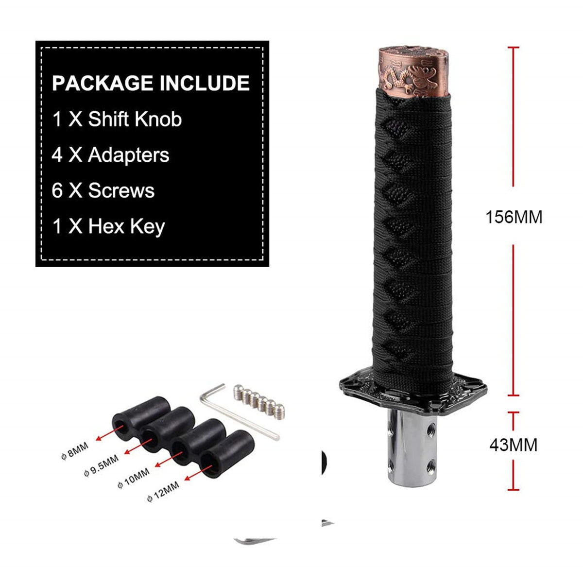 'Katana Style Katana Sword Style with classic Japanese braided pattern never out of date, clear and exquisite design, makes your car unique and cool. Durable Material Alloy+Synthetic silk+Imitative rayskin, never fade and wear-resistant, durable for long lifetime Universal Fit Gear shift knob works with most manual and automatic transmissions without lock/button (as long as the adapters fit) such as for Acura, Honda, Mazda, Mitsubishi, Toyota, Scion, Nissan... Color: Black+Black Material: Alloy+Synthetic silk+Imitative rayskin. Handle Height: 156 mm Handle Hole: 14 mm Fitment: Fit for most manual and automatic transmissions without lock/button (as long as the adapters fit) Package Include: 1*Shift Knob 4*Adapters(8 mm/9.5 mm/10 mm/12 mm) 6*Screws 1*Hex Key Installation Method 1. Remove original gear shift knob, 2. Choose suitable adapter to fit gear lever and knob, 3. Use 6 screws and hex key to tight knob. Notes: 1?Hole diameter is 14 mm, please make sure your gear lever diameter smaller than hole's. 2?Updated the 6 screws, it will come with a pointed top that tighten handle on shifter. 3?Gear shift knob fits for manual cars and most automatic cars which with button..''