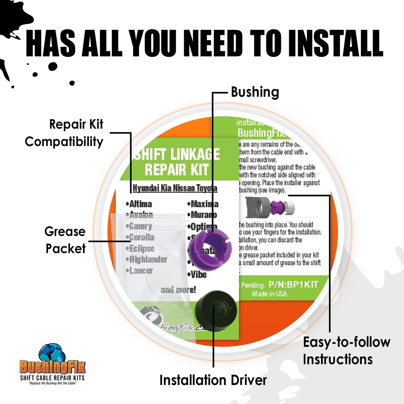 BushingFix BP1Kit Replacement Automatic Transmission Shift Cable Bushing Repair Kit comes with everything you need to replace your damaged transmission shifter cable bushing. This kit repairs the end of the cable located at the base of the gear shifter. Get the job done quickly, easily, and without the cost of having to replace the entire transmission cable! The kit comes with: a replacement bushing, installation tool, and grease packet. Our kit also includes text and video instructions along with reliable tech support to make the installation even easier. This bushing replacement fits: Nitro, Accent, Elantra, Genesis, Santa Fe, Sonata, Tiburon, Grand Cherokee, Sedona, Soul, and many more.