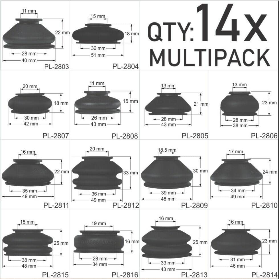 This Listing Is For Universal 14X Rubber Ball Joint Dust Boot Covers. Include: 14 Piece Material: Rubber Size: 11Mm X 27Mm X 25Mm X 37Mm 11Mm X 27Mm X 22Mm X 35.5Mm 13Mm X 28Mm X 22Mm X 39.5Mm 13Mm X 30Mm X 23Mm X 39Mm 13Mm X 30Mm X 24Mm X 43Mm 15Mm X 30Mm X 22.5Mm X 40Mm 16Mm X 33.5Mm X 25Mm X 42Mm 16Mm X 34Mm X 26Mm X 42Mm 16.5Mm X 37Mm X 43.5Mm X 29Mm 17Mm X 31Mm X 25.5Mm X 42.5Mm 20Mm X 30Mm X 17.5Mm X 38.5Mm 21Mm X 30Mm X 21Mm X 42Mm 21Mm X 35Mm X 28Mm X 47Mm 22.5Mm X 39Mm X 35.5Mm X 49Mm Specification 1.Car Trunk Suspension Steering Control Arms Protector 2.Ball Joint Boot Dust Replacement Guard Cover 3.This Is A Multi Use Item That Is Ideally Used In Garages But It Is Also Ideal For Day To Day Requirements Of D.I.Y Enthusiasts. 4.Please Note We Supply Universal Fit Rubber Boot Covers And They Can Fit Any Vehicle As Long As The Correct Size Of Boot Is Chosen Based On Your Specific Requirements.