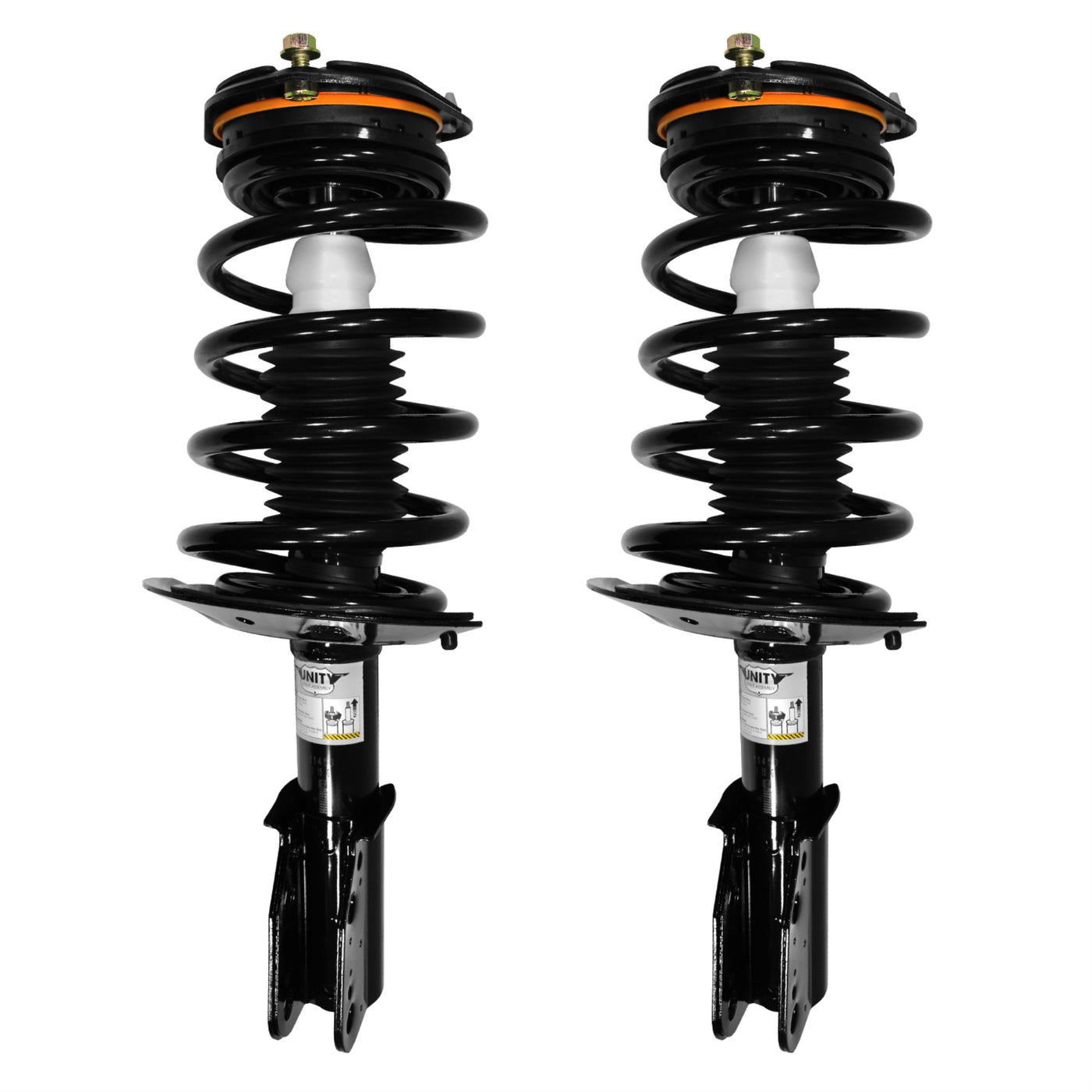 Q: What are the main features of the UNITY complete strut assembly?A: The UNITY complete strut assembly includes a preassembled suspension strut with components such as a top mount, bearing plate, bumper, insulators, and coil spring. This design restores your vehicle's factory ride height and provides a stable, comfortable ride.