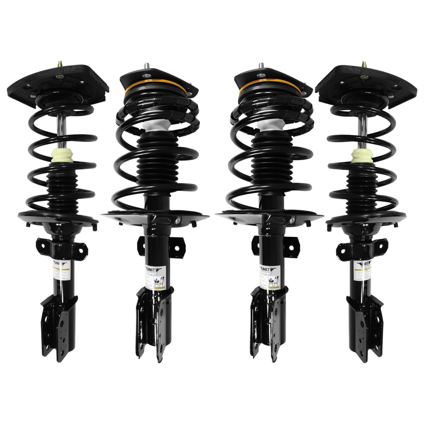 Q: What is included in the Unity Automotive 4 Wheel Complete Strut Assembly Kit?A: The Unity Automotive 4 Wheel Complete Strut Assembly Kit includes (2) Front and (2) Rear Complete Strut Assemblies, along with essential components such as top mounts, bearing plates, bumpers, insulators, and coil springs.