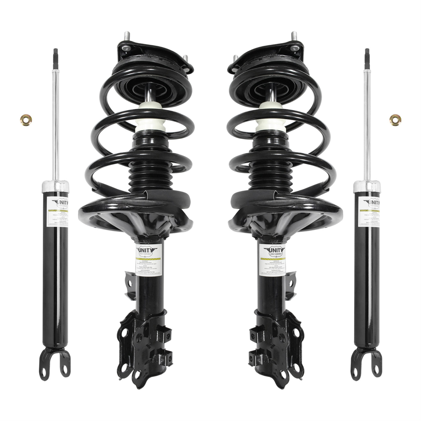 Q: What components are included in the Unity Automotive Complete Strut Assembly Shock Kit?A: The kit includes two front complete strut assemblies, preassembled and ready to install, and two rear nitrogen gas charged shock absorbers, providing everything you need for a complete suspension overhaul.