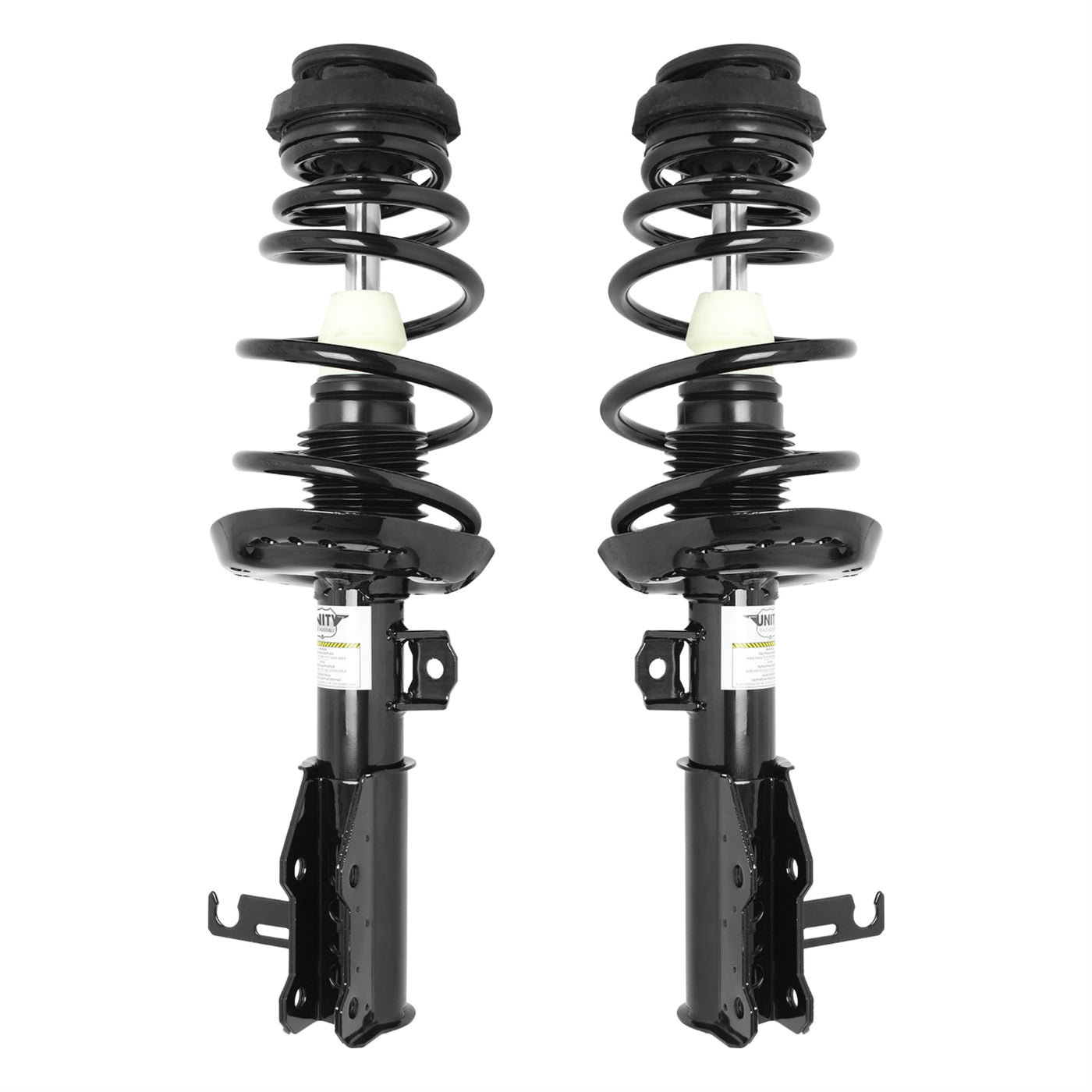 Q: What is included in the UNITY AUTOMOTIVE 2-11027-11028-001 Front 2 Wheel Complete Strut Assembly Kit?A: The kit includes two complete strut assemblies, which consist of a top mount, bearing plate, bumper, insulators, and coil spring, all preassembled for easy installation.
