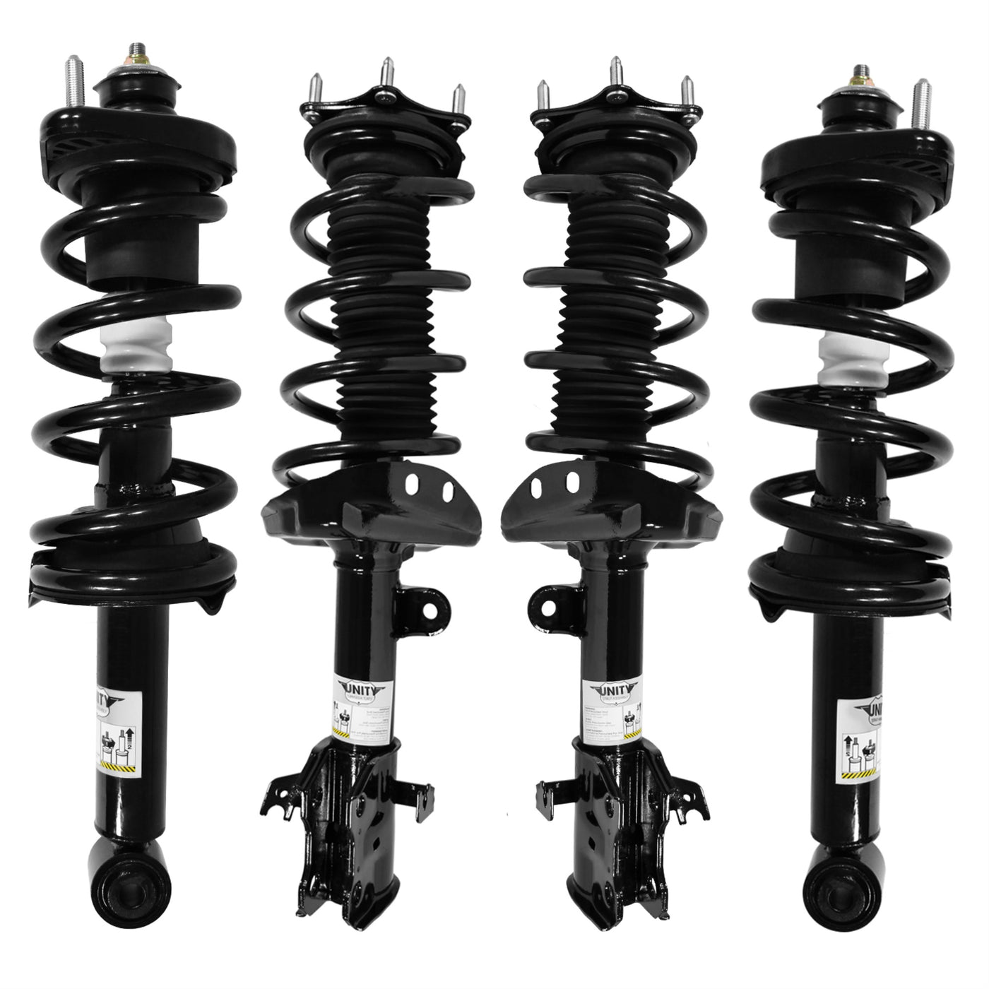 Q: What vehicles are compatible with the Unity Front and Rear 4 Wheel Complete Strut Assembly Kit?A: The Unity Front and Rear 4 Wheel Complete Strut Assembly Kit is designed to fit a wide range of vehicles. To ensure compatibility, please check the specific vehicle make, model, and year before purchasing. Refer to the manufacturer's guidelines or consult with a professional if needed.