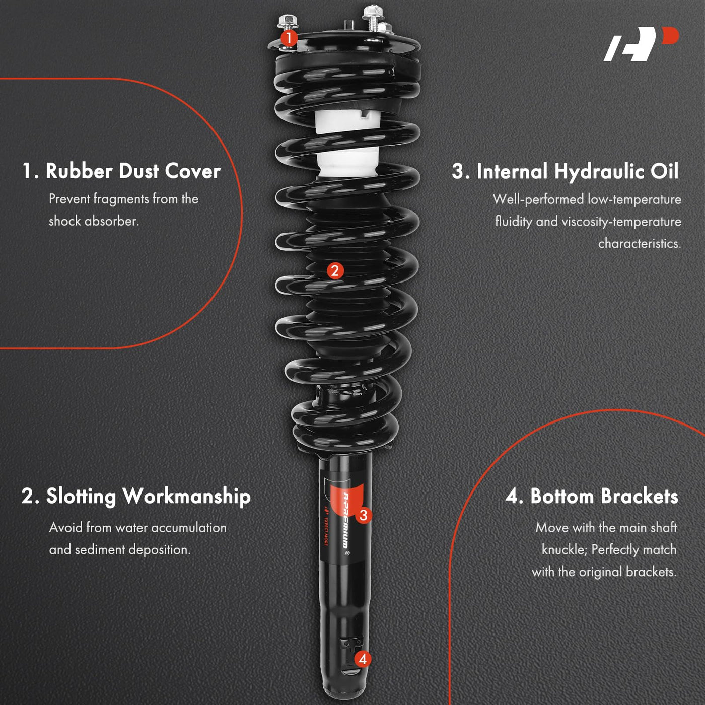Q: How does the A-Premium strut assembly compare to OEM parts?A: The A-Premium Complete Strut and Coil Spring Assembly meets or exceeds OEM specifications, making it a reliable replacement option for your vehicle's suspension system. It is crafted to high manufacturing standards, ensuring performance and durability comparable to original equipment.