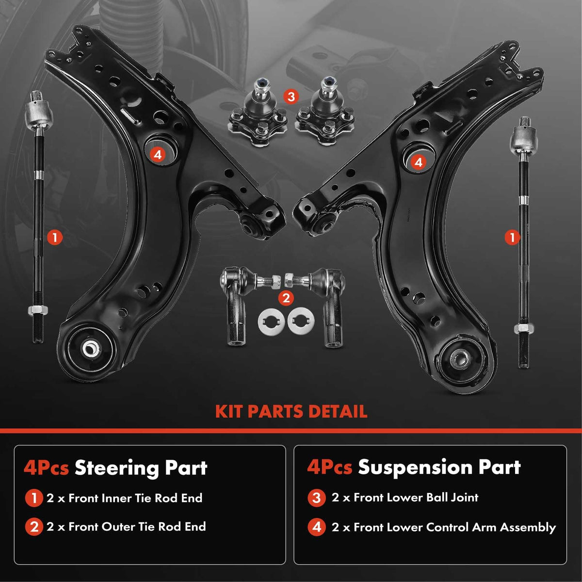 A-Premium Set Of 8, Front Lower Control Arm, Lower Ball Joint, Inner Outer Tie Rod End, Compatible With Volkswagen Jetta 1999-20