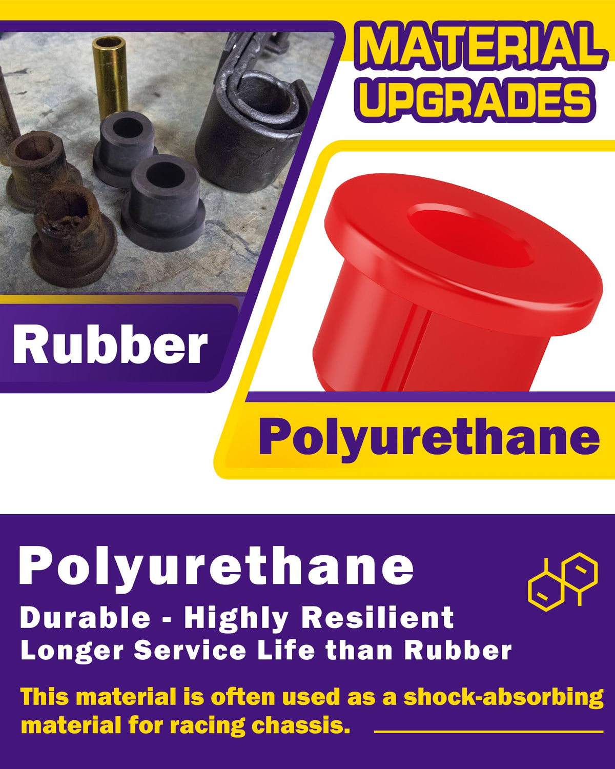 Q: How does the polyurethane material benefit these bushings?A: Polyurethane is known for its durability and resistance to wear, providing a longer service life compared to rubber and OEM materials. This means less frequent replacements and better performance.