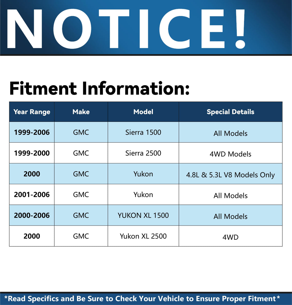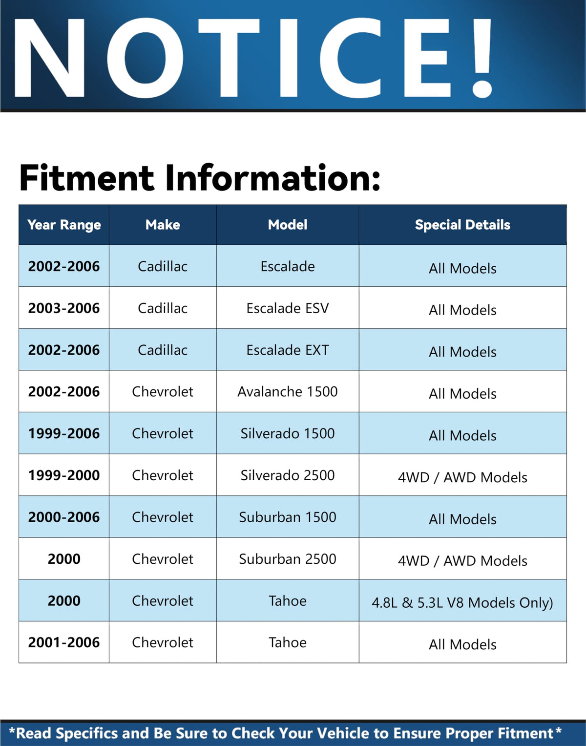 Kit Includes: 2x Front Inner Tie Rod End Link - ES3488 2x Front Outer Tie Rod End Link - ES3493 Fitment: Replacement For 2002-2006 Cadillac Escalade Replacement For 2003-2006 Cadillac Escalade ESV Replacement For 2002-2006 Cadillac Escalade EXT Replacement For 2002-2006 Chevrolet Avalanche 1500 Replacement For 1999-2006 Chevrolet Silverado 1500 Replacement For 1999-2000 Chevrolet Silverado 2500 (4WD / AWD Models) Replacement For 2000-2006 Chevrolet Suburban 1500 Replacement For 2000 Chevrolet Suburban 2500 (4WD / AWD Models) Replacement For 2000 Chevrolet Tahoe (4.8L & 5.3L V8 Models Only)) Replacement For 2001-2006 Chevrolet Tahoe Replacement For 1999-2006 GMC Sierra 1500 Replacement For 1999-2000 GMC Sierra 2500 (4WD Models) Replacement For 2000 GMC Yukon (4.8L & 5.3L V8 Models Only) Replacement For 2001-2006 GMC Yukon Replacement For 2000-2006 GMC Yukon XL 1500 Replacement For 2000 GMC Yukon XL 2500 (4WD) Introduction: Detroit Axle is a leading global retailer and distributor of OE re-manufactured and new aftermarket auto parts. We are committed to providing first-class products and outstanding customer service at an incredible value.