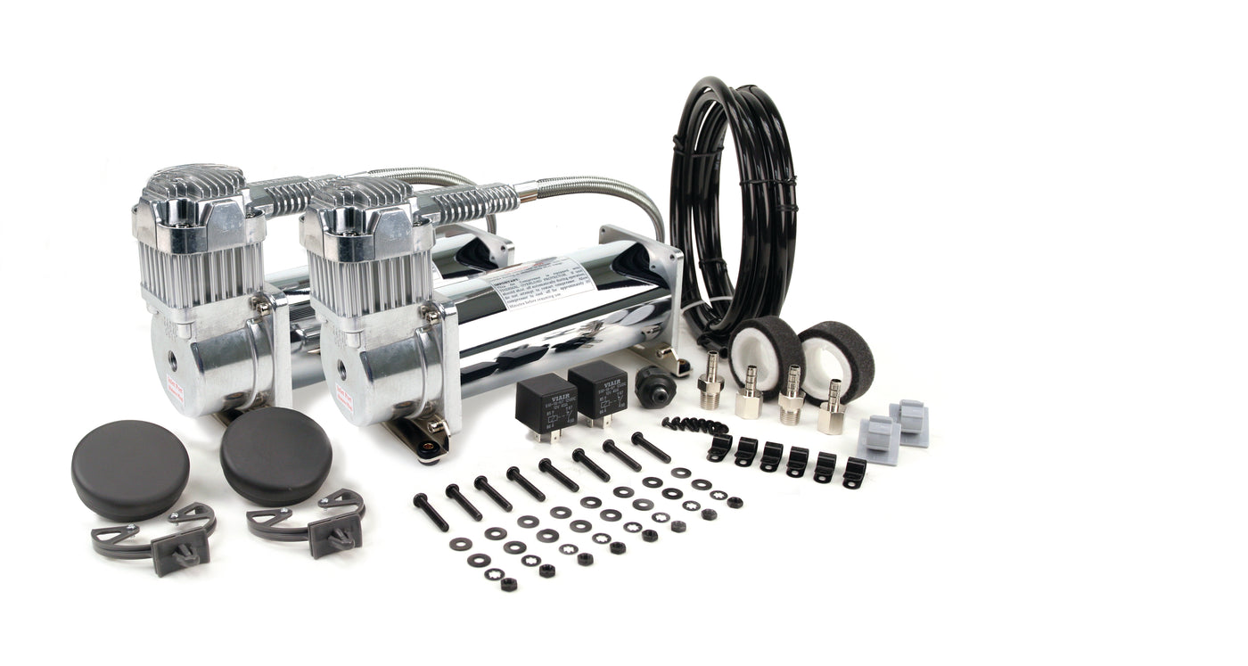 Q: Does the VIAIR 450C come with installation accessories?A: Yes, the VIAIR 450C Dual Performance Pack includes two heavy-duty 40-amp relays, an 110 PSI cut-on, 145 PSI cut-off pressure switch, and remote mount filter assemblies with mounting hardware for easy installation.