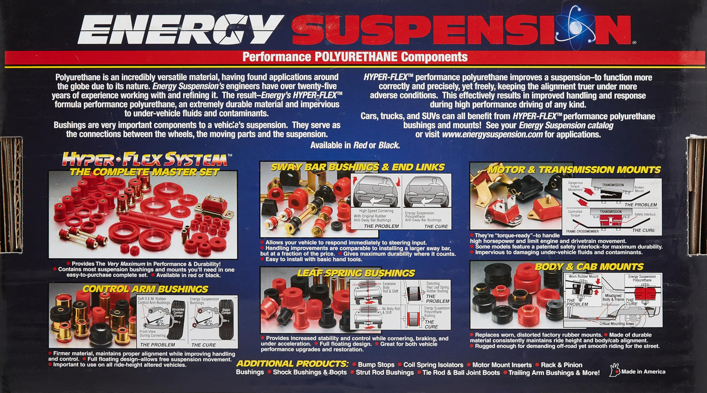 For over 30 years, Energy Suspension continues to be the World leader in performance polyurethane suspension technology. Dedication to manufacturing and developing superior products has established Energy Suspension as the most asked-for name in performance polyurethane components today.