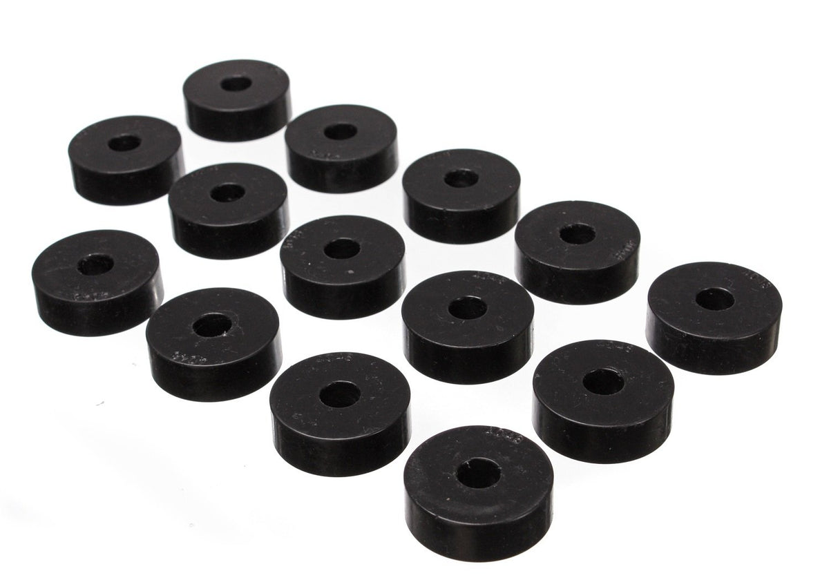 Q: What benefits does polyurethane provide over rubber in body mounts?A: Polyurethane components, like those used in the Energy Suspension body mount, are engineered to resist contaminants, provide better performance, and do not compress permanently, unlike rubber, which can degrade over time.