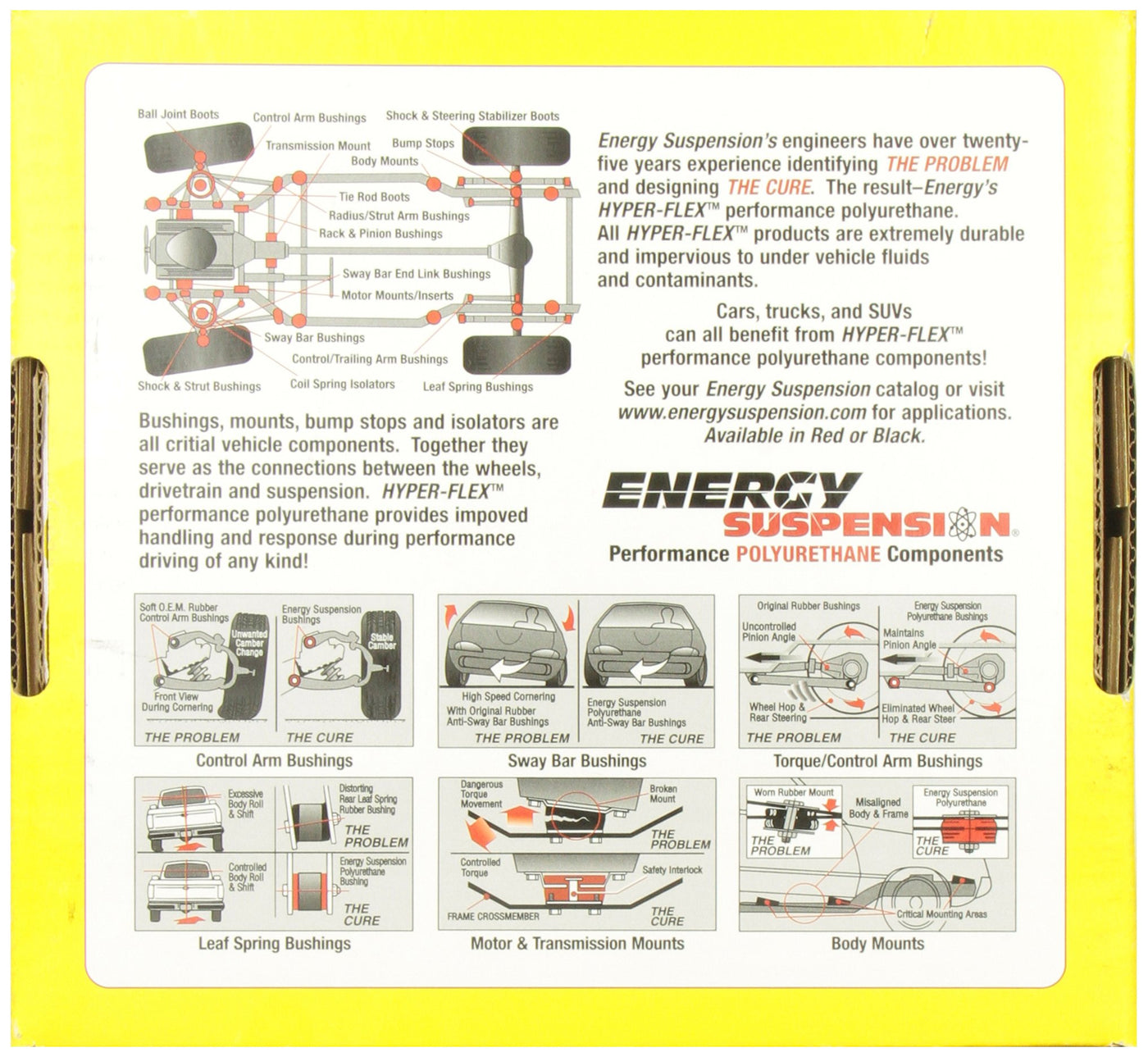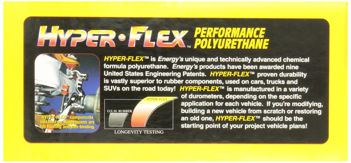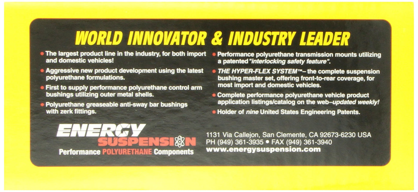 Q: What makes Energy Suspension's Bump Stop superior to rubber alternatives?A: Energy Suspension's Bump Stop is made from Hyper-Flex polyurethane, which offers superior durability against common undercar contaminants such as road salt and oil. Unlike rubber, which can degrade and compress permanently under weight and torque forces, Hyper-Flex components are engineered for long-lasting performance.
