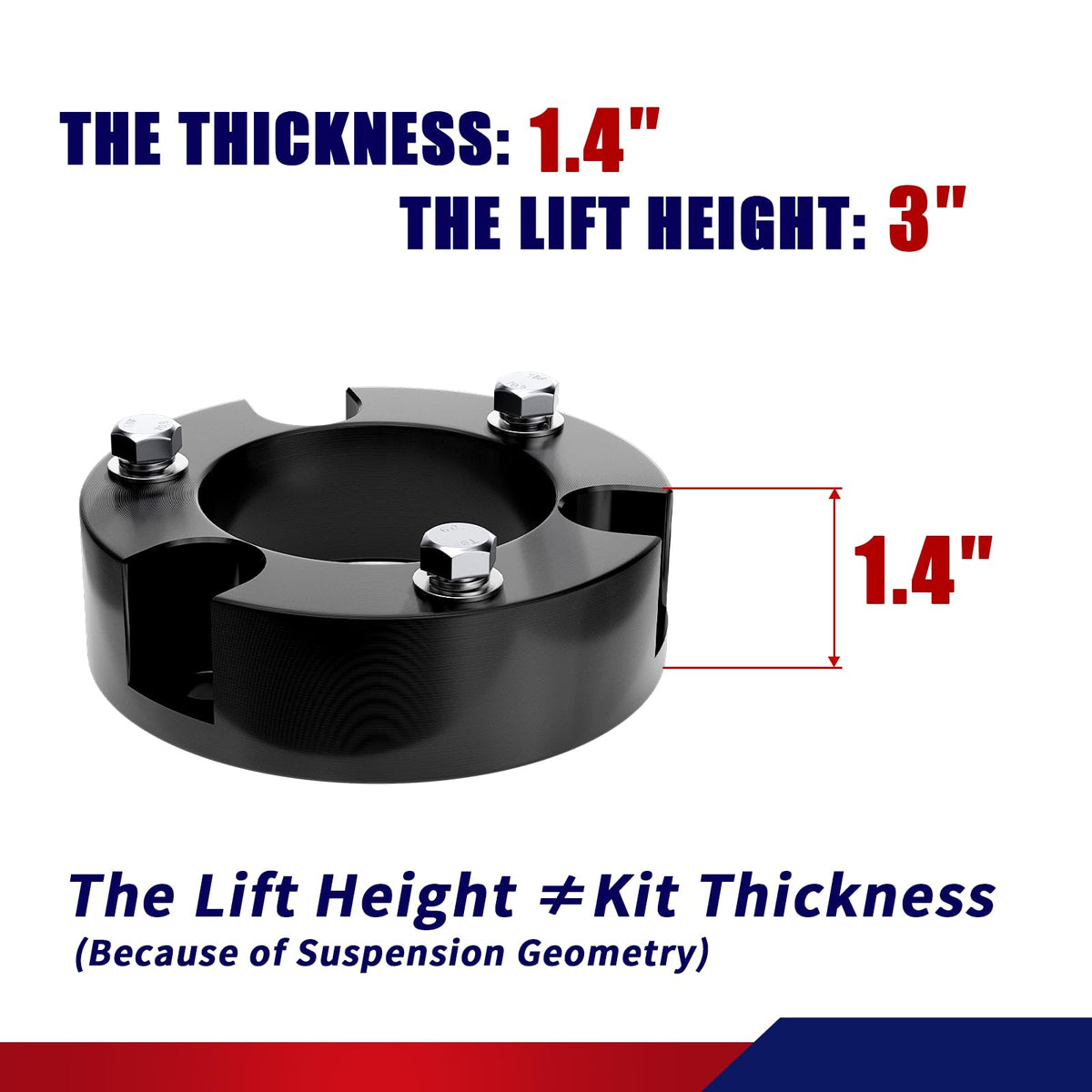 FITMENT : 3 Inch Front for 1999-2006 Tundra. | LIFT 3 INCH : Please note that the leveling kit's thickness less than 3 inch because of suspension geometry,the ratio between lift height and kit thickness is not 1:1.,but it will lift the truck to a true 3 inch | AGGRESSIVE LOOK : Once you install it on your truck,it will give your truck a cool look.Accurate numerical control precision and high quality, ensure your driving safe and comfortable | MATERIAL : Forged from 6061-T6 aluminum alloy,CNC automatic processing,surface anodic oxidation and heat treatment,not only ensure high precision and stability,but also enhance the hardness and corrosion resistance of the material | Brand Services : All FLYCLE Leveling kits are covered 2-year with worry-free after-sales service