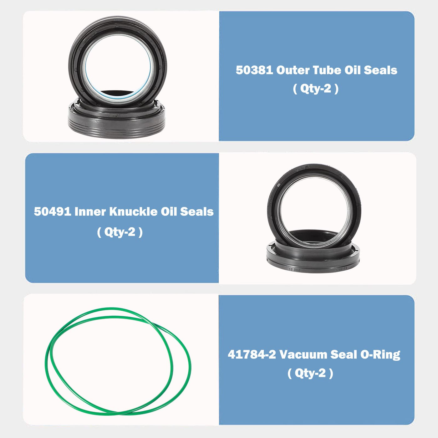 Q: What does the axle seal kit include?A: The kit includes two 50491 inner knuckle oil seals, two 50381 outer tube oil seals, and two 41784-2 vacuum seal O-rings, providing all the necessary components for your front axle maintenance.