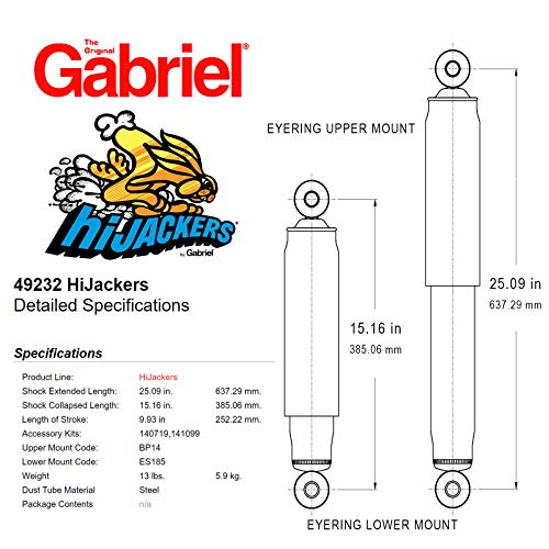Amazon.comAmericas best-known air-adjustable shocks absorber is ideal for temporary towing or short-term heavy loads. Gabriel Hijackers can help improve handling and can reduce the risk of bottoming-out, and provide extra lifting capacity of up to 1,100 pounds per pair. (Not to exceed vehicle GVWR (Gross Vehicle Weight Rating). Product does not increase payload.) All Gabriel shocks and struts feature a super-finished chromed piston rod thatprovides superior corrsion resistance for longer life. View largerGabriel Hijackers shocks are useful for a variety of applications: Americas best-known air-adjustable shock absorber Ideal for temporarily towing boats and trailers or for heavy loads Can help improve handling and can reduce the risk of bottoming out Up to 1,100 pounds per pair of extra lifting capacity Not to exceed vehicle GVWR (Gross Vehicle Weight Rating). Product does not increase payload.)And like all Gabriel shocks and struts, Hijackers shocks feature: A super-finished chromed piston rod to inhibit corrosion, ensure proper seal lubrication, provide a more consistent wear surface A leak-proof piston seal which extends product life D.O.M. (Drawn-Over-Mandrel) Tubing that reduces internal wear for longer product life About GabrielStarting in 1907, Gabriel invented the original shock absorber, followed by the first hydraulic shock absorber, the first adjustable shock absorber and the first air adjustable shock absorber. And today, it's still that same innovative, independent American company--building high-performance shocks and struts that cover over 96% of North American vehicles. Gabriel continues adding new product coverage, including expanding their line of ReadyMount strut assemblies, which make installation faster, safer and easier. And Gabriel continues that independent spirit, working hard to deliver innovative new products and services, every day.Product DescriptionGabriel HIJACKERS - Adjustable Air Shocks for TowingAbout GabrielGabriel has a long history of engineering high-quality ride control products for towing and hauling. The Gabriel Load Carriers are designed to provide best-in-class performance for vehicles carrying heavy loads or frequently towing trailers, boats, or cargo.Product DetailsAmericas best known air adjustable shocks absorber is ideal for temporary towing or short term heavy loads. Gabriel Hijackers can help improve handling, can reduce the risk of bottoming out, and provide leveling capacity of up to 1,100 lbs per pair. All Gabriel shocks and struts, hijackers feature a super finished chromed piston rod for superior corrosion resistance and a leak proof piston seal which extends product life.Product Features Chrome-plated piston rod construction and deluxe wiper seals provide optimum sealing. Custom-sized for a direct and simple installation and fit. Fully-adjustable air shocks help you maintain proper ride height. Sold in pairs and includes Gabriel Air Hose Kit when applicable Air Hose Kit can also be purchased separately. Ideal for temporarily towing boats and trailers or heavy loads. Easy to inflate at any service station, at home with an air compressor or with continued use of an existing onboard air management system. Can help improve handling and reduce risk of bottoming out Up to 1,100 pounds of leveling capacity per pair (not to exceed GVWR).InstallationFollow the vehicles specific installation instructions for best results. Ensure all hardware is torqued to manufacturer specifications.Vehicle FitmentPlease use the Confirmed Fit Tool to ensure this part fits your vehicle.95-01 Ford Explorer; 01-05 Ford Explorer Sport Trac; 97-01 Mercury Mountaineer