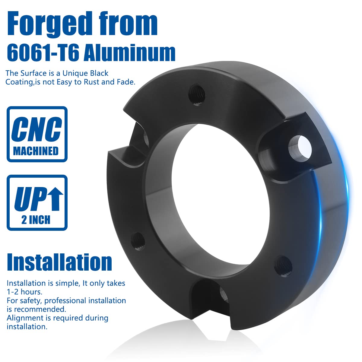 Package Included package: 2 x 2inch Black Front Leveling Lift Kit Strut Spacers Benefits Perfectly levels the front with the rear of the vehicle, expand the gap between the wheel and the fender, and gain additional ground clearance, making the vehicle look more aggressive. You can install larger and wider tires/rims Material Forged from 6061 T6 aluminum, with 12.9 studs, more sturdy and reliable.The surface is a unique black coating, is not easy to rust and fade Note Due to the geometry of the suspension, the lift height and kit thickness are not 1:1, they will raise the front truck by 2'', but the front kit thickness is less than 2'' Installation Bolt fixing, easy to install, no vehicle modification required.It takes about 1-2 hours, without the need to remove the strut/coil like other kits.Save your time and money ! Not difficult, but professional installation is recommended. It is recommended to align after installation.Need to align the installation