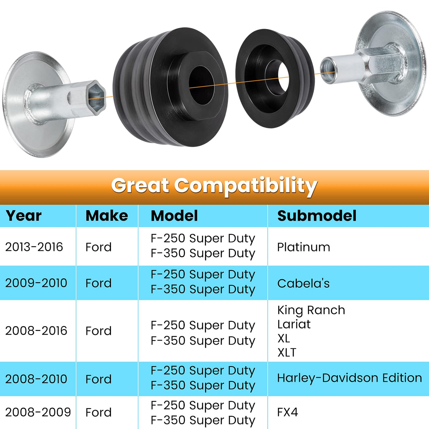 Q: What vehicles is the KF04060BK Body Mount Bushing Kit compatible with?A: The KF04060BK Body Mount Bushing Kit is specifically designed to fit 2008-2016 Ford F-250 and F-350 Super Duty models in both 2WD and 4WD configurations, including XL, XLT, FX4, Lariat, Platinum, Cabela's, King Ranch, and Harley-Davidson Edition.