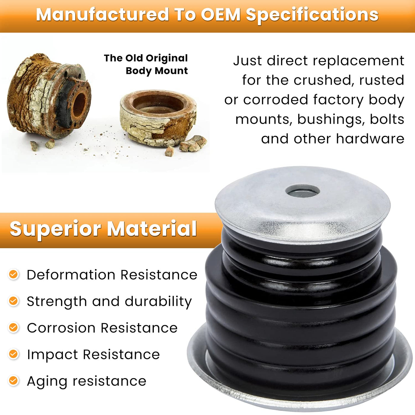 Q: What materials are used in the construction of this body mount bushing kit?A: This body mount bushing kit is made from premium-grade high-density polyurethane, offering superior strength and durability. It also includes high-quality plated steel OEM style body bushing sleeves and hardware for optimal performance.