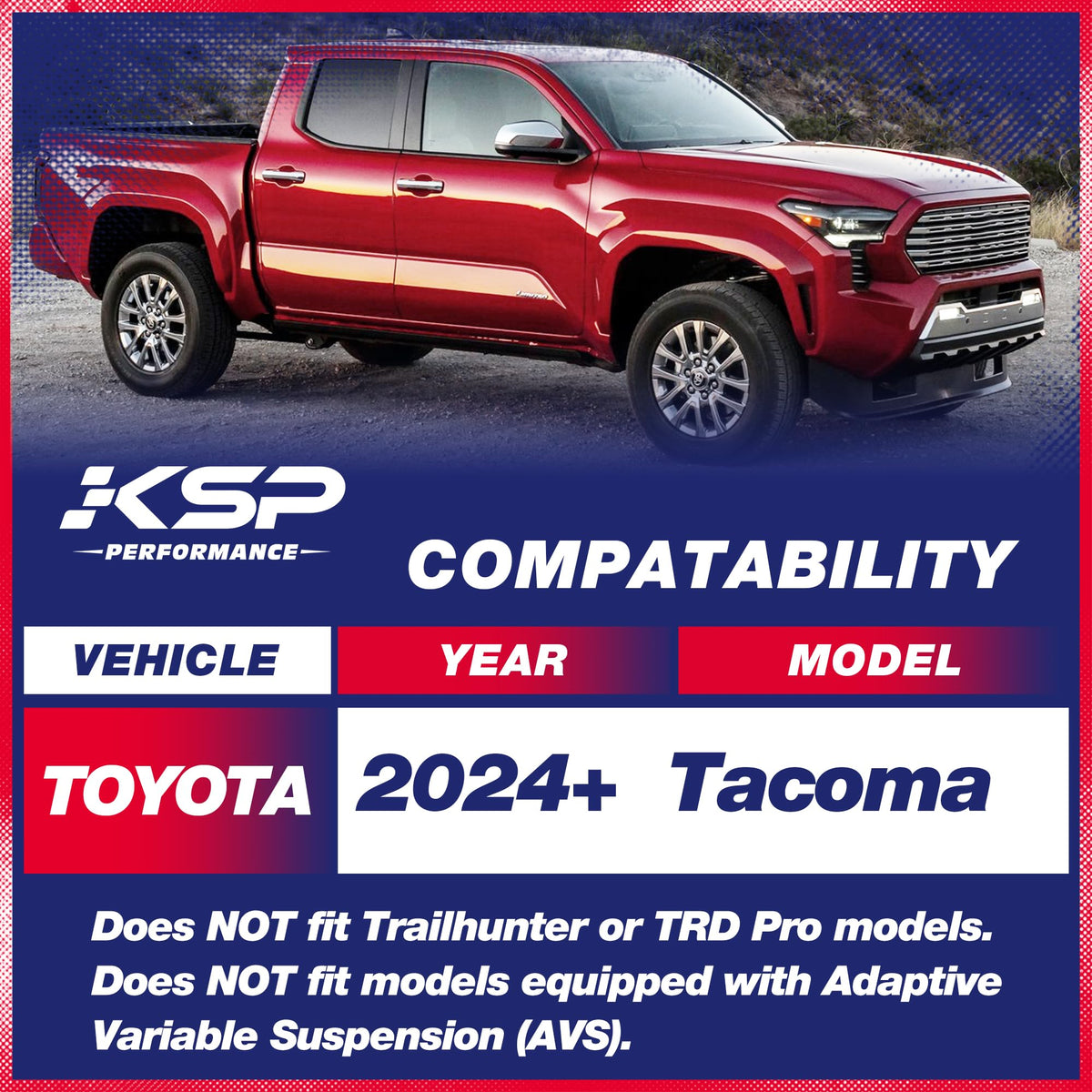 'Please NOTE:Lift amount does NOT equal spacer thickness. Due to suspension geometry, the ratio between lift height and kit thickness is not 1:1. Please message us for more information. Fitment: 2024+ T-oyota Tacoma Does NOT fit Trailhunter or TRD Pro models. Does NOT fit models equipped with Adaptive Variable Suspension (AVS). Note: 1.5'''' lift kit require trimming of the shock bolts or they will not fit!!! KSP performance front leveling kit will raise the front of your truck by a true 1.5''''. Front leveling kit was made of high quality 6061-T6 aluminum material. This level kit can increase ground clearance and levels the front of the vehicle but factory ride quality maintained. Larger rims and tires can be allowed after install this kit. Its easy to install takes 1 to 2 hours just using basic tools. PDF files Installation Instructions can be request if you need. An alignment is recommended after the installation of this item. If have any question, please feel free to contact us by Amazon messages. We will try our best to supplying 100% Customer Satisfaction Guarantee. ''