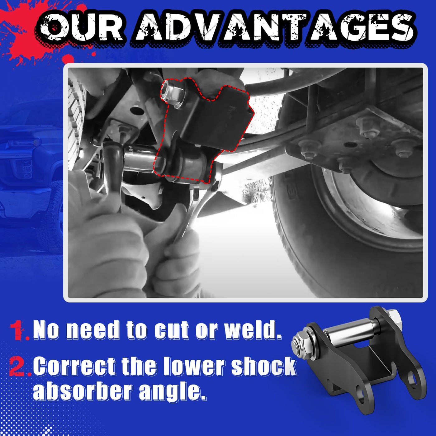 Q: What is the purpose of using shock extenders for my truck?A: Shock extenders help correct the angle of the lower shock absorber, improving stability and preventing issues like shock overextending and premature wear. This helps extend the service life of your shock absorbers, especially for lowered vehicles.