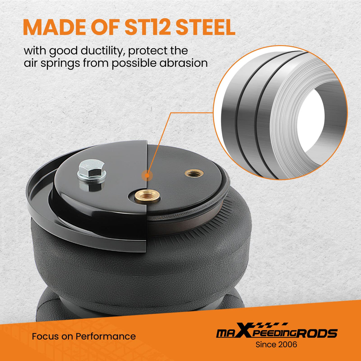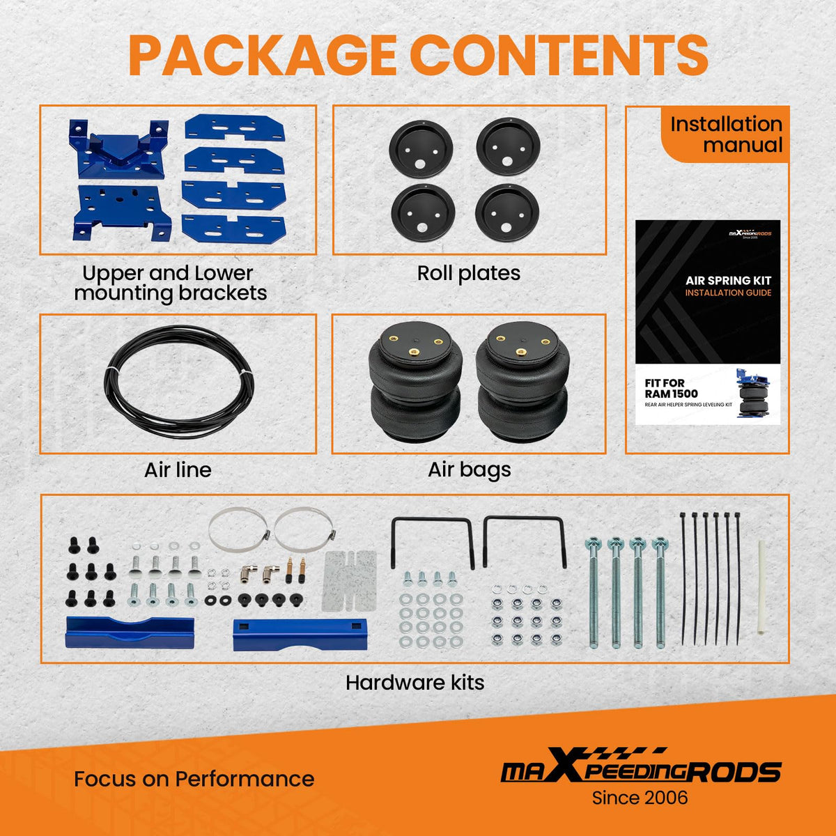[High adaptability] The air spring are suitable for the following models: for Dodge Ram 2500 2003-2013 4WD, for Dodge Ram 3500 2003-2018 4WD. Mainly suitable for vehicles with leaf springs | ?Practical Installation?This is a complete air spring kit, no drilling or modification is required. There's an installation manual in the package, and you can find the installation video on the product detail page if needed. | [Package Includes] 2x Air springs, 1x Air line, 2x Schrader valve, 2x Air fitting connector, 6x Mounting Bracket, Hardware kit | [Benefits of Air Spring] With Internal Jounce Bumper, preventing air spring suspension kit from being completely compacted in the impact caused by heavy objects, potholes, curbs, or objects on the road | [Warranty&Service] maXpeedingrods warrants its products against manufacturing defects under normal use for 1 year (since the date of purchase), and lifetime technical support and customer service.