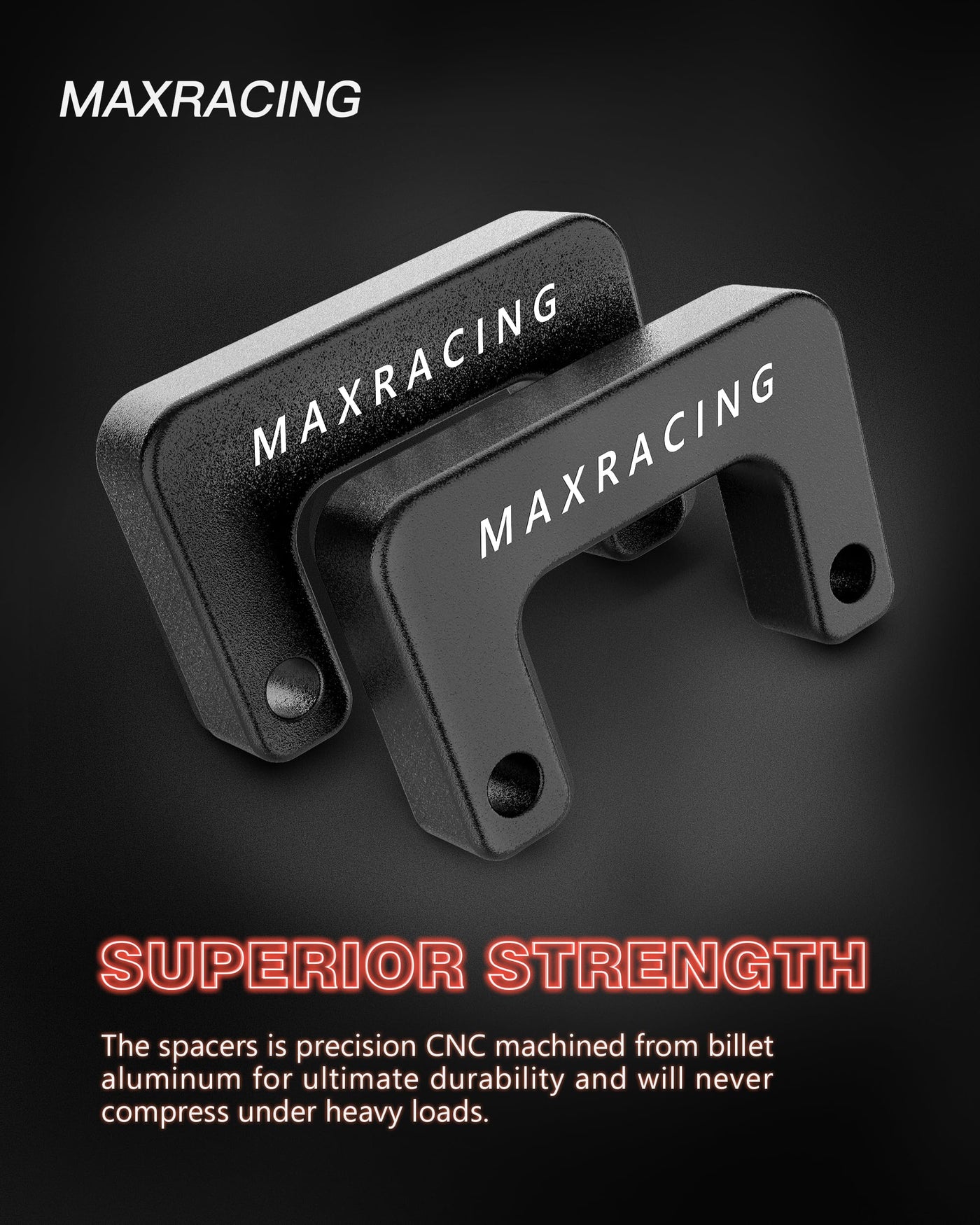 Q: What materials are used in the construction of the lift kit?A: The Maxracing Leveling Lift Kit is made from high-quality CNC machined billet aluminum, which is known for its strength and durability. The front spacers are powder-coated black for added corrosion resistance and anti-rust properties.