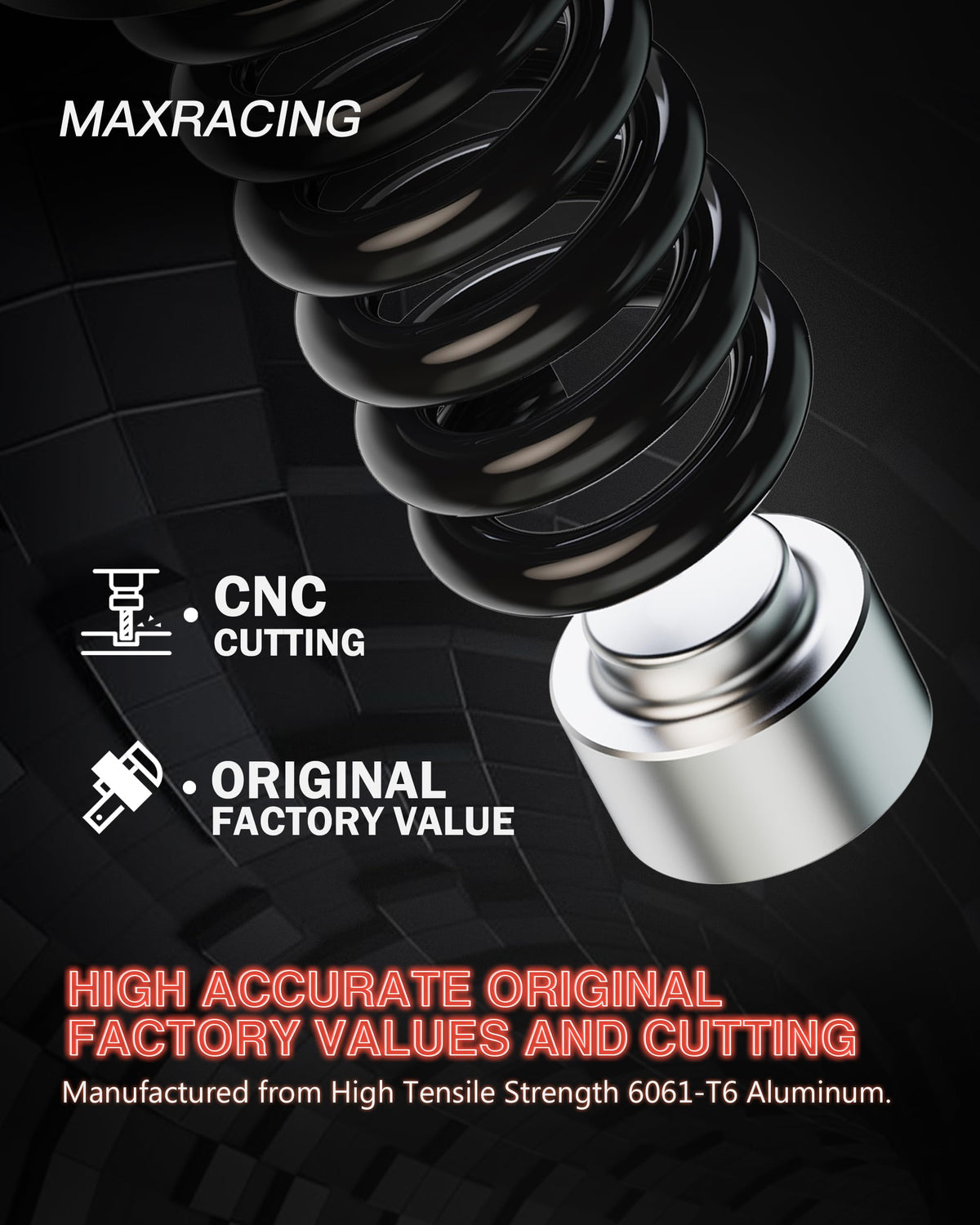 Q: What materials are used in the Maxracing Lift Kit?A: The Maxracing Leveling Lift Kit is made from high-strength billet aluminum, which is powder-coated black for enhanced durability. This material provides excellent corrosion resistance and is designed to withstand wear over time.