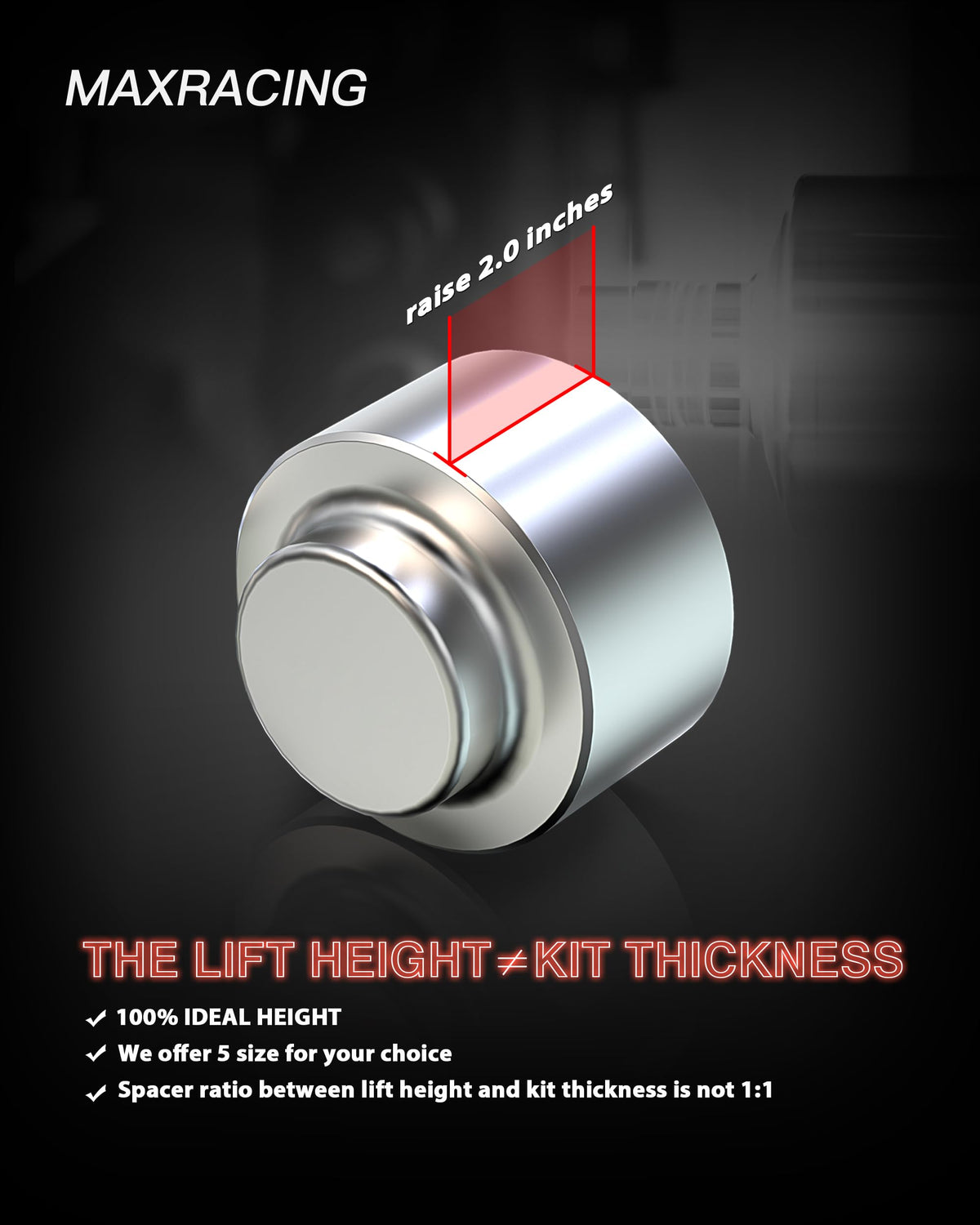 Q: How much lift does the Maxracing leveling kit provide?A: This leveling kit will raise the rear of your truck by a true 2 inches. It's important to note that the spacer thickness is less than 2 inches, as the lift amount is not a 1 to 1 ratio.