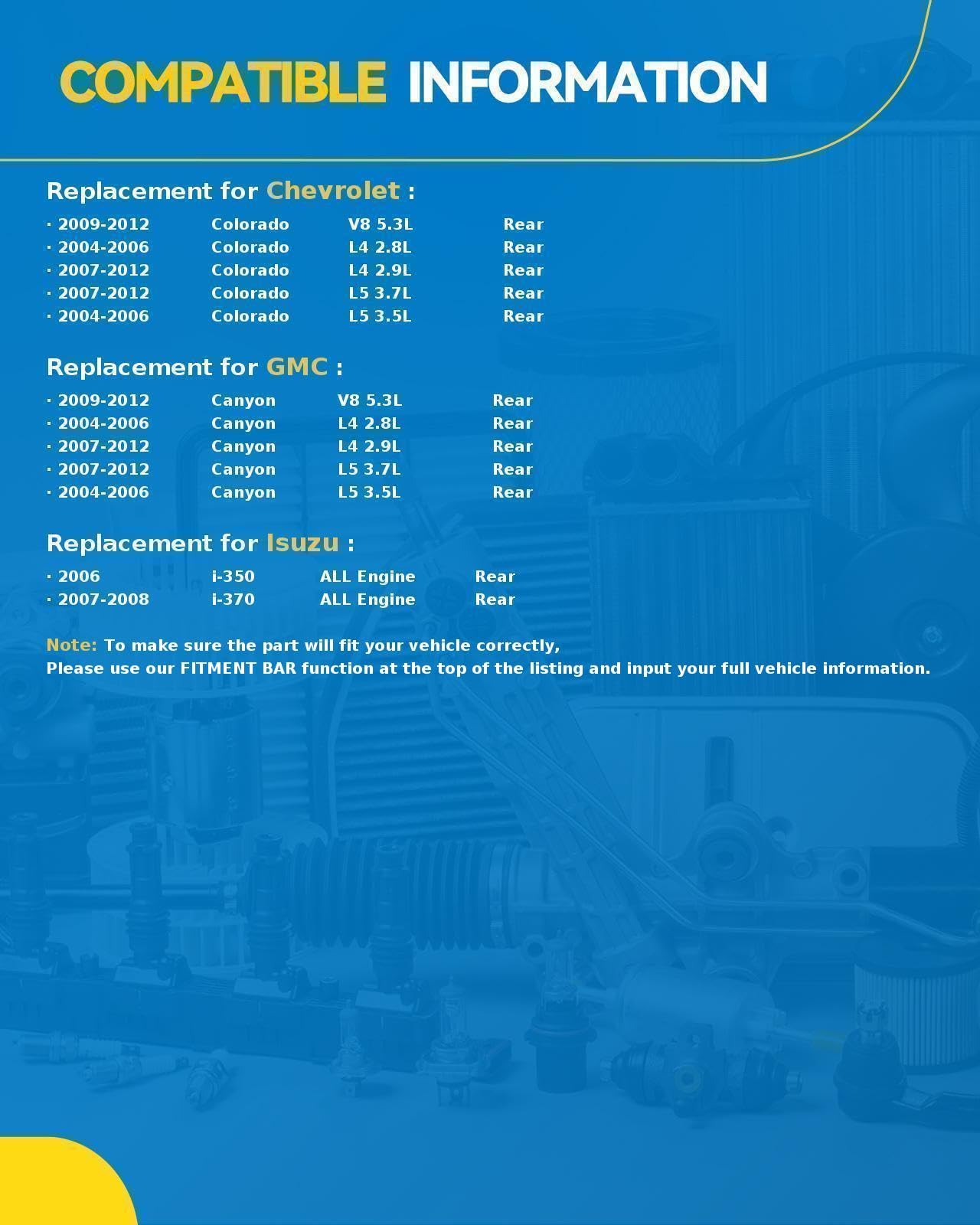 Struts Fitment: PHILTOP Complete Struts Replacement for 2004-2012 Colorado, 2004-2012 Canyon, 2007-2008 i-370, 2006 i-350, Please Comfirm our products are compatible with your car | Improved Handling: Shock struts help improve the handling of a vehicle by providing better stability and reducing body roll. This can make the vehicle more responsive and easier to control, especially during sudden maneuvers or when driving on uneven terrain. | OE-Quality, Vehicle-Specific Design: Application specific coil spring, mount and strut feature an OE-style design to ensure an optimized ride and handling experience unique to each vehicle profile. #Manufacturer Part Number: 911230*2 | Recovery Performance Of 100%: Struts that are worn out add 20% to halting distance. After changing the PHILTOP struts component, reduce the stopping distance and increase the safety distance. Boost your driving confidence while reducing halting distance and increasing steering speed. | Increased Safety: Shock struts help improve safety by providing better traction and reducing the risk of skidding or losing control during sudden braking or acceleration. They also help reduce the wear and tear on other suspension components, which can lead to a safer and more reliable vehicle overall.