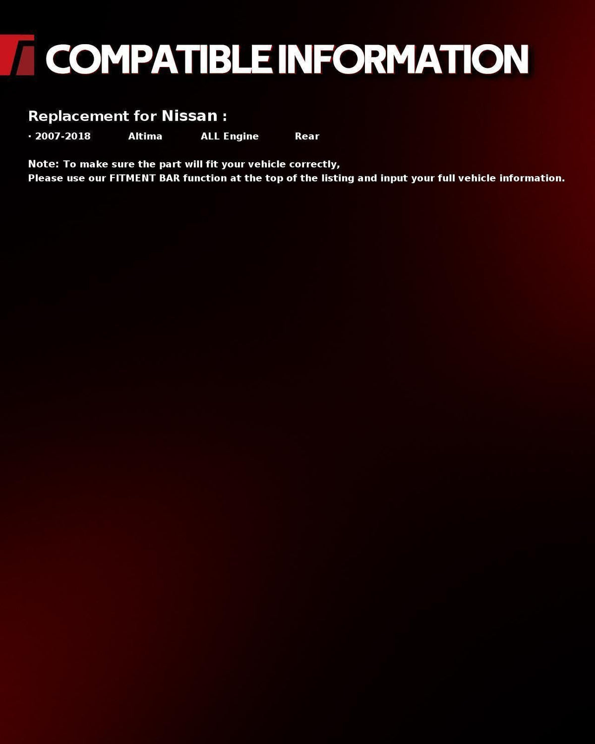 ?FITMENT? Torchbeam Shocks Absorber Struts Replacement for Nissan Altima 2007-2018. | ?KIT INCLUDES? 2 Pcs (1 Pair) of shocks absorber struts. Replace shocks absorber struts: 5637, 349075, G51874, E6210JA00D, E6210ZX10A, E6210JA01A, E6210JA80B, E62103TA1B, E6210ZX00A, 255030, 33196, SBA60716, 341688, E62109HS1A, E62109HS1H. | ?Easy Installation? These Torchbeam Shocks absorber are easy to install and require no special tools or skills. The installation process quick and straightforward. | ?Made to Last? This Torchbeam shock absorber is manufactured with high-quality steel, featuring a superior tube and weld design to deliver structural integrity and durability. This shock absorber adopts ASD technology to reduce vehicle tilt and improve vehicle sway, and the mechanical sensing valve quickly senses the ground impact to adjust the oil flow. | ?Quality After-sales Guarantee? If you have any problems with the product you received, you can contact us at any time. Torchbeam provide a 10-year manufacturer's warranty and 24-hour after-sales service.