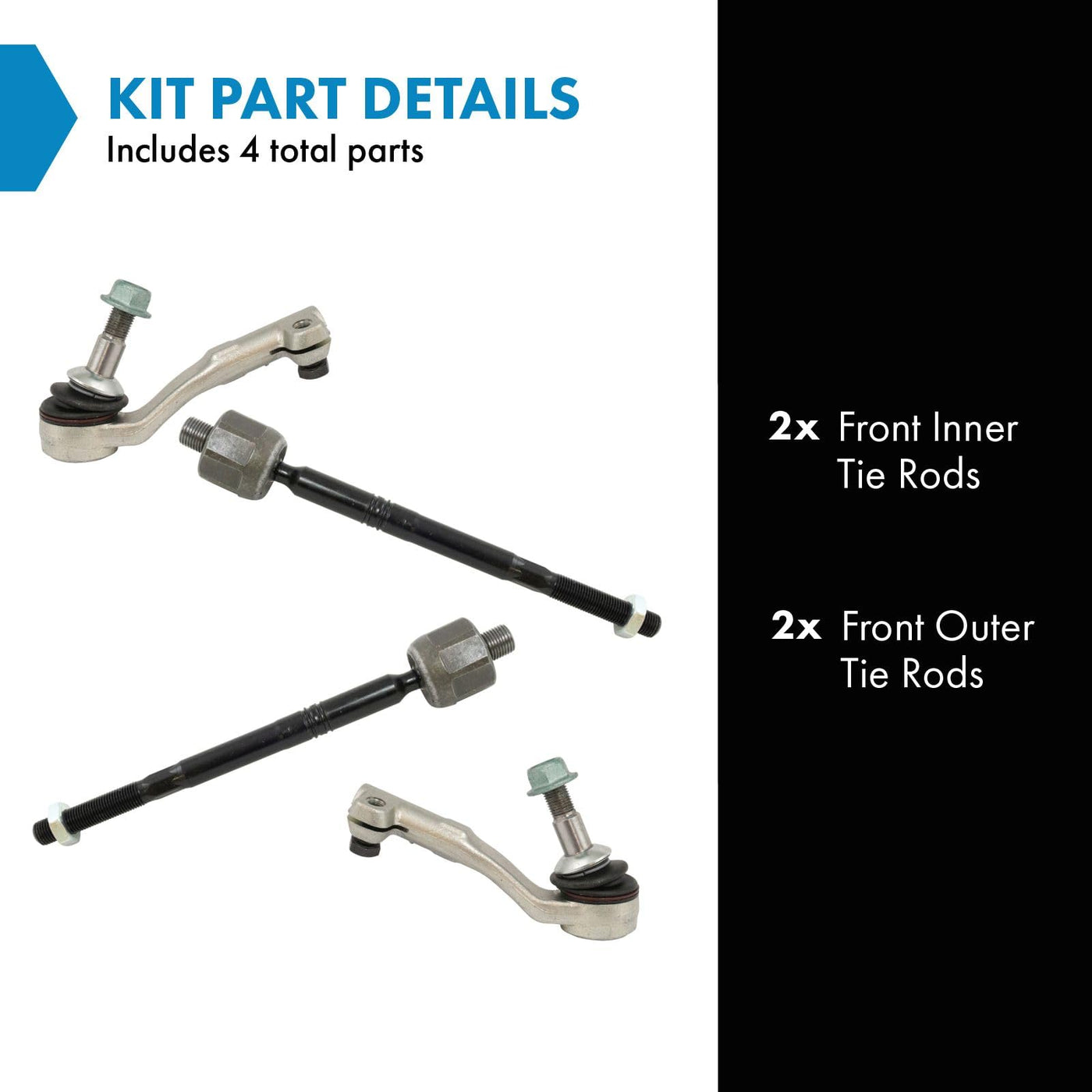 4 Piece Tie Rod SetKit Includes(2) Front Inner Tie Rods(2) Front Outer Tie RodsFitmentCompatible with: 2014-16 BMW 328i Front Driver & Passenger Side Inner & OuterCompatible with: 2012-13 BMW 328i L4 2.0L Front Driver & Passenger Side Inner & OuterCompatible with: 2013-18 BMW 320i Front Driver & Passenger Side Inner & OuterCompatible with: 2014-16 BMW 428i Front Driver & Passenger Side Inner & OuterCompatible with: 2017-18 BMW 330i Front Driver & Passenger Side Inner & OuterCompatible with: 2017-20 BMW 430i Front Driver & Passenger Side Inner & OuterCompatible with: 2017-20 BMW 430i Gran Coupe Front Driver & Passenger Side Inner & OuterCompatible with: 2012-13 BMW 335i Sedan Front Driver & Passenger Side Inner & OuterCompatible with: 2015-16 BMW 428i Gran Coupe Front Driver & Passenger Side Inner & OuterCompatible with: 2014-16 BMW 435i Front Driver & Passenger Side Inner & OuterCompatible with: 2014-16 BMW 228i Front Driver & Passenger Side Inner & OuterCompatible with: 2017-20 BMW 230i Front Driver & Passenger Side Inner & OuterCompatible with: 2016-18 BMW 340i Front Driver & Passenger Side Inner & OuterCompatible with: 2014-16 BMW M235i Front Driver & Passenger Side Inner & OuterCompatible with: 2014-15 BMW 335i Front Driver & Passenger Side Inner & OuterCompatible with: 2016-18 BMW 330e Front Driver & Passenger Side Inner & OuterCompatible with: 2014-18 BMW 328d Front Driver & Passenger Side Inner & OuterCompatible with: 2017-20 BMW M240i Front Driver & Passenger Side Inner & OuterCompatible with: 2018-20 BMW 440i Front Driver & Passenger Side Inner & OuterCompatible with: 2017-20 BMW 440i Gran Coupe Front Driver & Passenger Side Inner & OuterCompatible with: 2015-16 BMW 435i Gran Coupe Front Driver & Passenger Side Inner & OuterCompatible with: 2017 BMW 440i Convertible Front Driver & Passenger Side Inner & OuterCompatible with: 2013-15 BMW ActiveHybrid 3 Front Driver & Passenger Side Inner & OuterProduct AttributesQuantity: 4 PieceReference NumbersACDelco: MS106122, MS106123Autopart International: 2600508328Beck/Arnley: 101-7999, 101-8001, 101-8002, 101-8391, 101-8393, 101-8655, 1017999BMW: 32106-799-967, 32106799960, 32106799965, 32106799966, 32106799967Corteco: 49399908, 49400244CTR: CE0843L, CE0843RDelphi: TA3170, TA3220, TA3221DIY Solutions: SUS04422, SUS08195, SUS08196, SUS08197Dorman: TO14232Febi-Bilstein: 44283MAS Industries: TO14231, TO14232Mevotech Supreme: MS106122, MS106123Mevotech: MS106122, MS106123, MS10778MOOG Chassis Products: ES801051, ES801052, EV801303NAPA Chassis Parts: 2693968, 2694055Nissan: 29046252OMNIPARTS: 29046124, 29046125, 29046252Quinton Hazell: QR3920SRTS: 91-99519-1, 91-99519-2, 92-99517SIDEM: 21630, 21631SPIDAN: 51317, 51318TRW Steering and Suspension Parts: JTE604