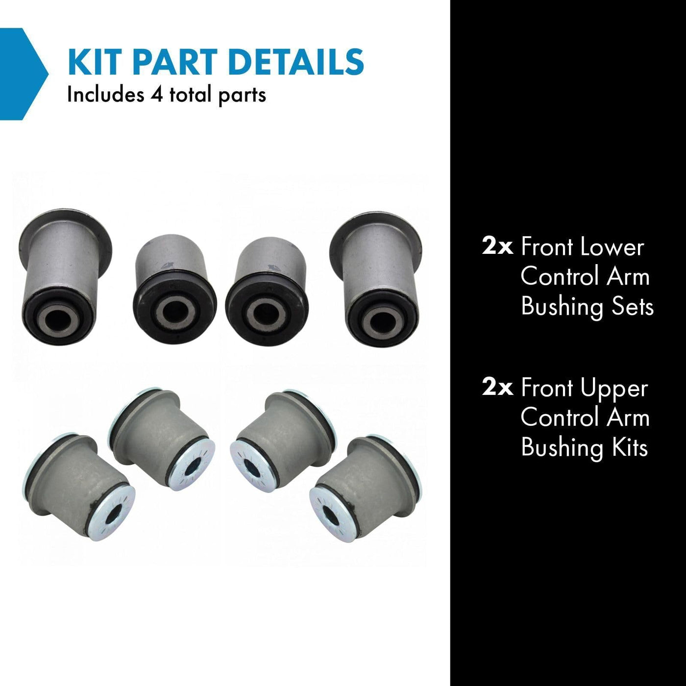 8 Piece Control Arm Bushing SetKit Includes(2) Front Lower Control Arm Bushing Sets(2) Front Upper Control Arm Bushing KitsFitmentCompatible with: 1989-99 Chevrolet K1500 Truck with Stamped Steel Lower Control Arms Front Driver & Passenger Side Upper & LowerCompatible with: 1990-05 Chevrolet Astro All Wheel Drive Front Driver & Passenger Side Upper & LowerCompatible with: 1989-99 GMC K1500 Truck with Stamped Steel Lower Control Arms Front Driver & Passenger Side Upper & LowerCompatible with: 1996-99 Chevrolet Tahoe with Stamped Steel Lower Control Arms Front Driver & Passenger Side Upper & LowerCompatible with: 1989-99 Chevrolet K2500 Truck with Stamped Steel Lower Control Arms Front Driver & Passenger Side Upper & LowerCompatible with: 1992-99 Chevrolet Suburban K1500 with Stamped Steel Lower Control Arms Front Driver & Passenger Side Upper & LowerCompatible with: 1989-99 Chevrolet K3500 Truck with Stamped Steel Lower Control Arms Front Driver & Passenger Side Upper & LowerCompatible with: 1992-99 GMC Yukon 4 Wheel Drive with Stamped Steel Lower Control Arms Front Driver & Passenger Side Upper & LowerCompatible with: 1990-05 GMC Safari All Wheel Drive Front Driver & Passenger Side Upper & LowerCompatible with: 1989-99 GMC K2500 Truck with Stamped Steel Lower Control Arms Front Driver & Passenger Side Upper & LowerCompatible with: 2000 Chevrolet Tahoe Z71 with Stamped Steel Lower Control Arms Front Driver & Passenger Side Upper & LowerCompatible with: 2000 Chevrolet Tahoe Limited with Stamped Steel Lower Control Arms Front Driver & Passenger Side Upper & LowerCompatible with: 1992-99 GMC Suburban K1500 with Stamped Steel Lower Control Arms Front Driver & Passenger Side Upper & LowerCompatible with: 1992-99 Chevrolet Suburban K2500 with Stamped Steel Lower Control Arms Front Driver & Passenger Side Upper & LowerCompatible with: 1992-99 GMC K3500 Truck with Stamped Steel Lower Control Arms Front Driver & Passenger Side Upper & LowerCompatible with: 2000 GMC Yukon Denali with Stamped Steel Lower Control Arms Front Driver & Passenger Side Upper & LowerCompatible with: 1995 Chevrolet Tahoe 4 Wheel Drive with Stamped Steel Lower Control Arms Front Driver & Passenger Side Upper & LowerCompatible with: 1995 Chevrolet Tahoe Rear Wheel Drive with 43mm Bushings with Stamped Steel Lower Control Arms Front Driver & Passenger Side Upper & LowerCompatible with: 1992-94 Chevrolet Blazer with Stamped Steel Lower Control Arms Front Driver & Passenger Side Upper & LowerCompatible with: 1999-00 Cadillac Escalade with Stamped Steel Lower Control Arms Front Driver & Passenger Side Upper & LowerCompatible with: 1992-99 GMC Suburban K2500 with Stamped Steel Lower Control Arms Front Driver & Passenger Side Upper & LowerProduct AttributesQuantity: 8 PieceReference NumbersACDelco: 45G8057, 45G9100, 45G9101Autospecialty: 04-86003, 04-86005, 04-86011, 486003, 486005, 486011AutoZone: FB553, FB561Centric Parts: 602.66021DIY Solutions: SUS06281Dorman - OE Solutions: 533-452, 533-456Dorman - Premium: BB6329PR, BB6395PRDorman: 531-450, 535-772Duralast: FB553, FB561Euclid: E-6362-TU, E-6388-TU, E6362, E6366, E6388Firestone: K6329, K6395Flagg Suspension Parts: SP9048General Motors: 15567827, 15567828, 15607586, 15993180Import Direct Chassis: K6395MAS Industries: BB6329, BB6395Mcquay-Norris: FB553, FB561Mevotech: MK6329, MK6395MOOG Chassis Products: K6329, K6395NAPA Chassis Parts: 267-1379, 267-3423, 267-3424, 267-4459, 2671379NAPA Proformer: 12572Parts Master: K6329, K6395Perfect Circle: 267-1379, 267-3423Raybestos Brakes: 560-1057, 565-1100, 565-1101, 5701075, 5701076Sealed Power: 807-12572, 807-60126TRW Steering and Suspension Parts: 12532, 12572, JBU900