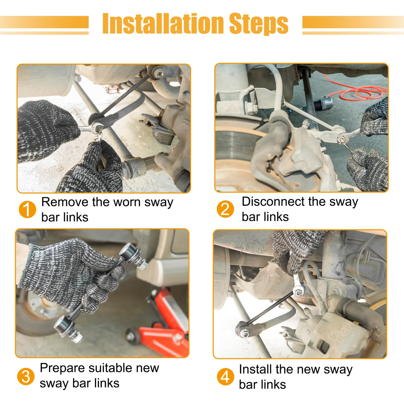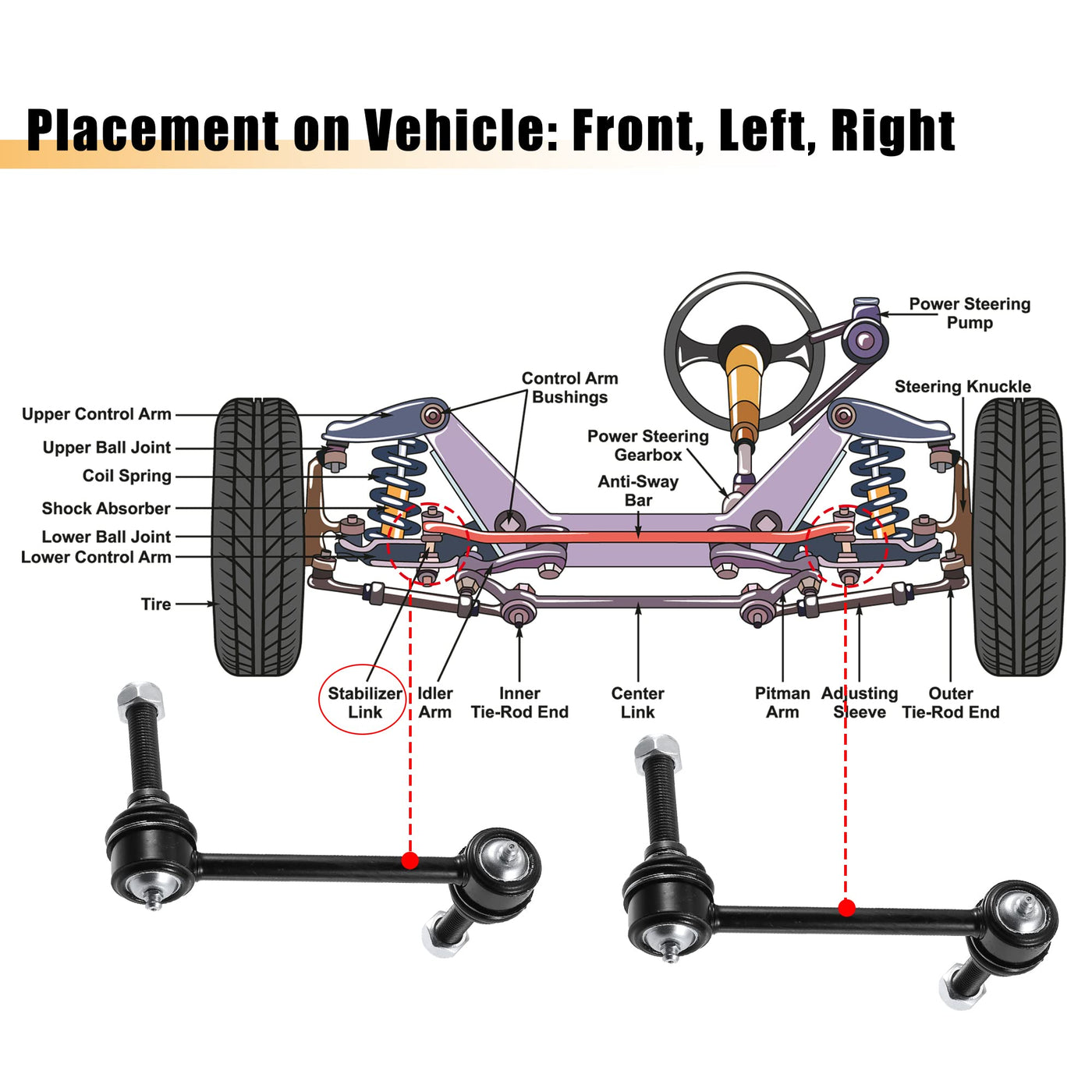Features:The end links replacement Built to withstand the tough driving conditions.The durable stabilizer sway bar is rust and corrosion-resistant.Please make sure that the suspension parts are suitable for your vehicle before ordering.This is a non-OEM product, accessory only!Symptoms of Worn-out Sway Bar Links:A knocking, or clunking noise from the suspension when driving slow over road bumpsAfter putting the vehicle on a lift the sway bar link will looseness when pushed up or down itCar's handling ability decreased, and visible damage in the suspension systemSpecifications:Color: BlackMaterial: MetalManufacturer Part Number: K80946, K80948Other OE Number(s): 4882004020, 4882060050, 4881004010, 4881060040Placement On Vehicle: Front, Left, RightType: Stabilizer bar link kitsThread Size: M12x1.5Front Links Dimension: 17.5x9x3.5cm / 6.89x3.54x1.38(L*W*H)Fitment:for Toyota Tacoma 2WD 2005-2017for Toyota Tacoma 4WD 2005-2017for Toyota Tacoma Double Cab 2013-2014for Toyota Tacoma Double Cab 2018-2022Installation Steps:1?Remove the worn sway bar end links2?Disconnect the adjustable stabilizer links3?Prepare suitable new sway bar links4?Install the new suspension link kitPackage Includes:2 x Front Sway Bar Links