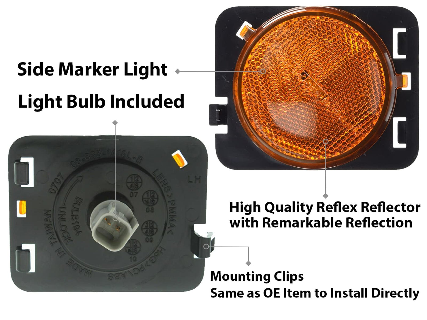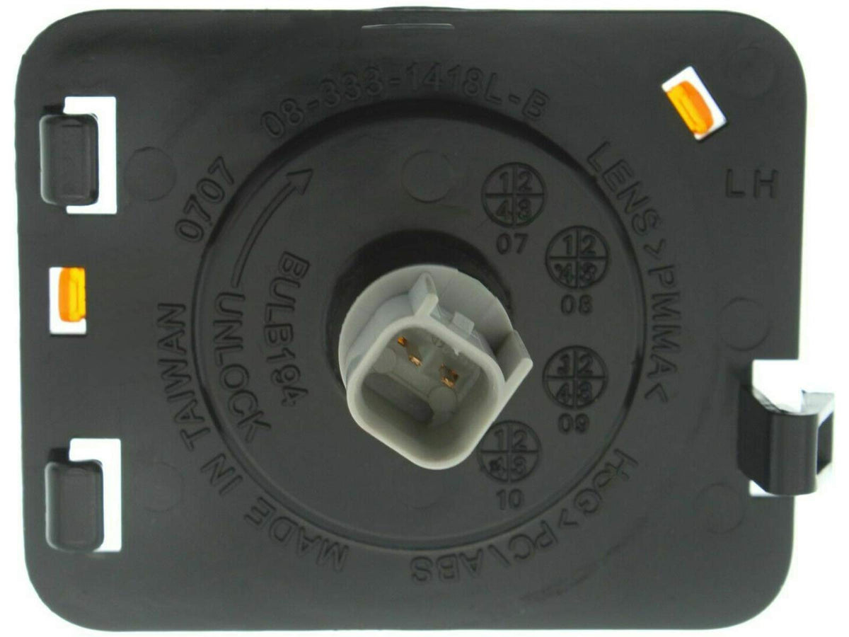 Aftermarket OEM Replacement SIDE MARKER LIGHT Position : Front Part , Driver Left LH Side Features : Side Marker , Side Repeater , Reflex Reflector , Light Bulb Included Made in Taiwan (DOT) Department of Transportation and (SAE) Society of Automotive Engineers Approval Direct Replacement. Built to strict quality control standards We recommend that installation be done by professionals, as item will not come with installation instructions and we do not provide any installation/troubleshooting assistance Fits OEM Part Number: 55078145AA Fits Partslink Numbers: CH2550127 Fits Model and Year: 2018 2017 2016 2015 2014 2013 2012 2011 2010 2009 2008 2007 18 17 16 15 14 13 12 11 10 09 08 07 Jeep Wrangler