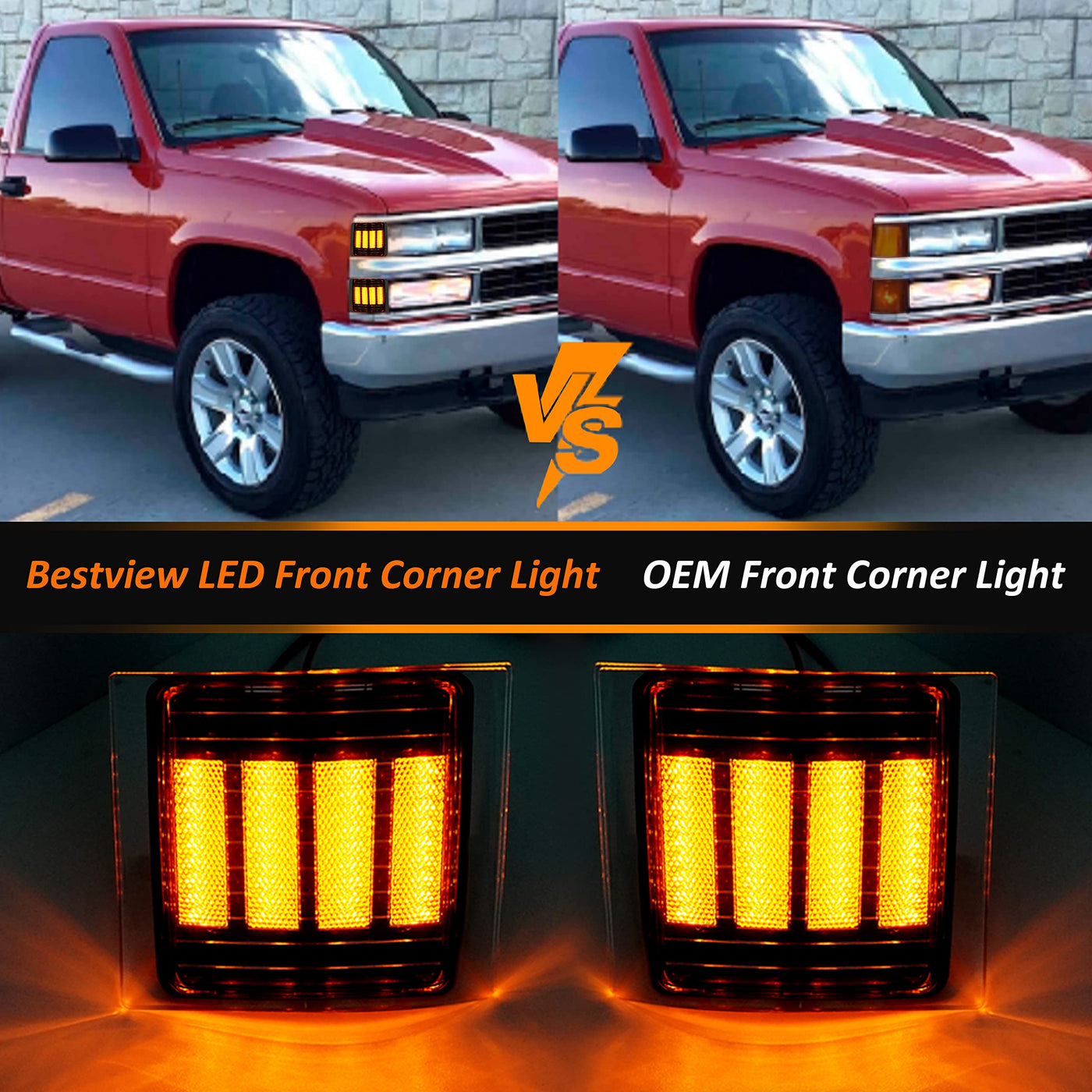 Q: How bright are these LED corner lights compared to stock lights?A: These LED corner lights feature a high-performance SMD 2835 LED Chip that provides 600% more brightness compared to standard stock corner lights, delivering a dynamic amber color for enhanced visibility.