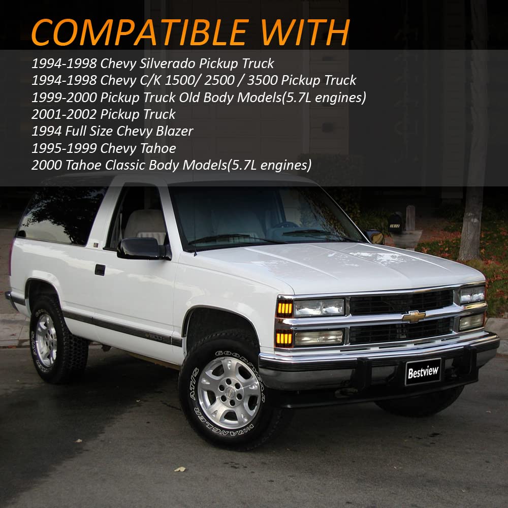?Fitment?Bestview Led Front Corner Light Is Compatible With C10 1994-1998 Chevy Silverado Pickup Truck, 1994-1998 Chevy C/K 1500 / 2500 / 3500 Pickup Truck, 1994-998 Chevy Silverado, 1999-2000 Pickup Truck Old Body Models(5.7L Engines), 2001-2002 Pickup Truck, 1994 Full Size Chevy Blazer, 1995-1999 Chevy Tahoe, 2000 Tahoe Classic Body Models (5.7L Engines) | ?600% Brightness?Upgrades Your Led Front Corner Lights With High Peformance Smd 2835 Led Chip, 3000K Sequential Amber Color. 6 Times More Brighter Than Stock Corner Lights. New Fascinating Design Makes Your Vehicle Be Different And Stand Out From The Crowd. | ?Durable Quality?Bestview Led Front Light Is Made Of Premium Abs Plastic Housing And Pc Lens, Waterproof Ip67, Energy Saving, Over 50,000 Hours Lifespan, No Faded With Long-Time Exposure. Non-Polarity So That You Won'T Be Confused When Installing. | ?Plug & Play?Simple & Easy Installation. Just Take 15 Minutes To Replace The New. No Modification, No Trimming, No Drilling Needed. ' | ?What'S Included?4Pcs Led Front Corner Lights With Plastic Housing. 1 Year Warranty Since Order Purchase Date To Ensure 100% Satisfaction. Feel Free To Email If There'S Any Issue Before Or After Purchase, Your Case Will Be Taken Seriously Regardless Of Warranty Period.