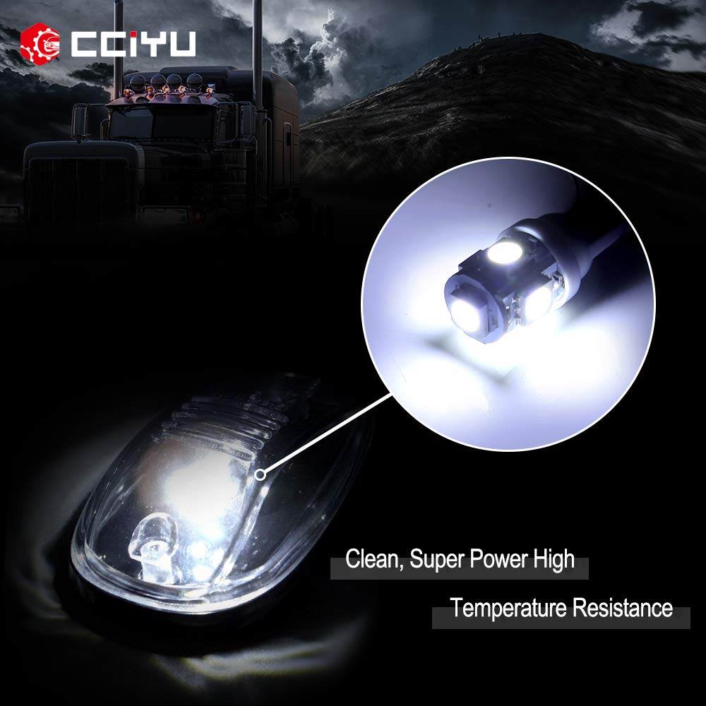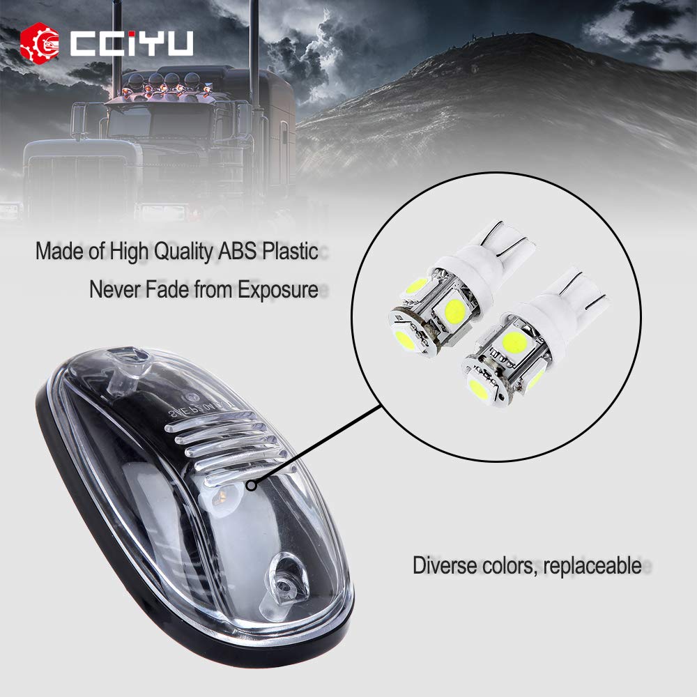 Q: What is included in the package for the cciyu Cab Roof Marker Running Light?A: The package includes 5 smoke cab marker assemblies, 5 white 5050SMD LED bulbs, and 1 wiring pack, which contains a switch, short wire with fuse, long wire, metal screws, and plastic rings.
