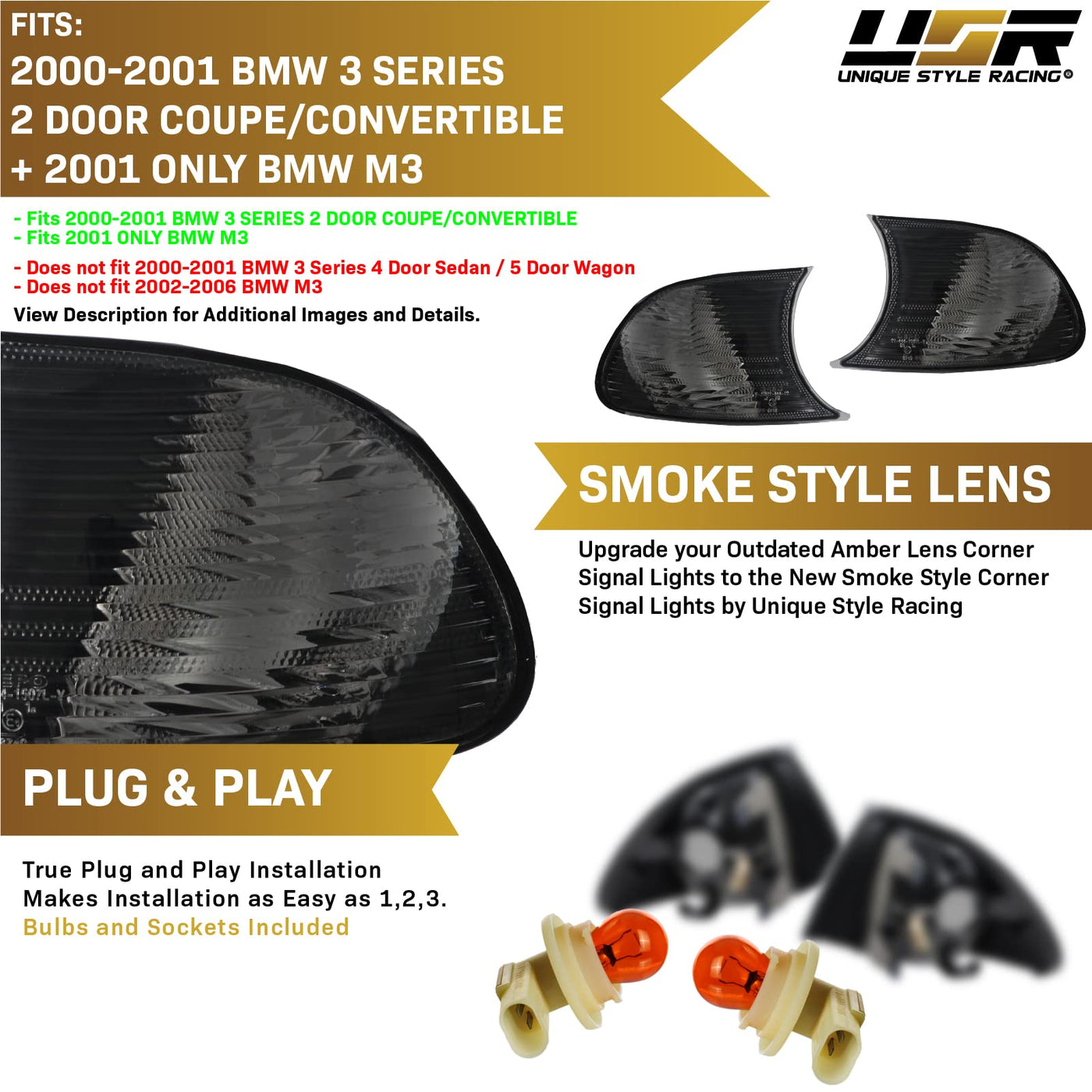 Original Euro Spec Look - As Seen On The European Models Of Bmws, Unique Smoked Lens Style Of Cornering Turn Signal Light For Your Pre-Facelift Bmw E46 2 Door Coupe And Convertible. Easy Plug & Play To Upgrade Your 3-Series. Perfect Accessory Gift For Bmw E46 Enthusiast! Fraction Of The Cost Of Oem - Oem Fitment And Molded To Fit Like Stock Parts To Meet Your Upgrade Needs. High-Quality - Polycarbonate Assembly Manufactured In Taiwan; Provides Uv-Protected Lens With High Impact And Water Resistance. Plug And Play Ready - 1 Pair Of Amber Incandescent Bulbs Included Making This A True Plug-N-Play Solution. Quick And Easy Diy Install With Basic Tools. No Re-Wiring Or Modifications Needed. Peace Of Mind Guaranteed - Usr Products Come With A 1 Year Warranty, So Don'T Hesitate To Reach Out Should Any Concerns Arise. If You Are Outside Of The Warranty Period, Contact Us Anyway. We Strive To Provide A Favorable Resolution To Retain Your Satisfaction. Please Note - These Corner Lights Fit For 2000-2001 Bmw E46 3 Series 2 Door Coupe And Convertible And 2001 E46 M3 Which Comes With Clip-On Version Of Corner Light. This Will Not Fit On A Screw-On Corner Light Type. Please Make Sure You Purchase The Correct Setup Or It Would Not Fit.
